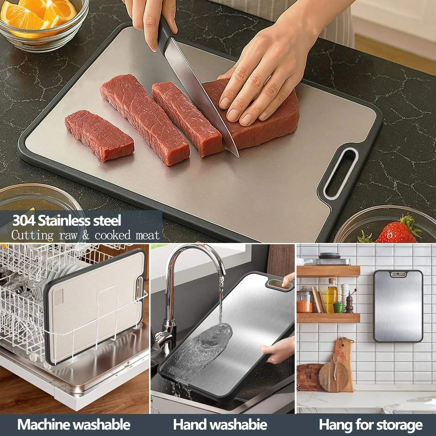 ·Healthy and safe: Use the kitchen cutting board to cut different ingredients separately to avoid cross contamination. Stainless steel cutting boards will be no sawdust falling and sticking to the ingredients