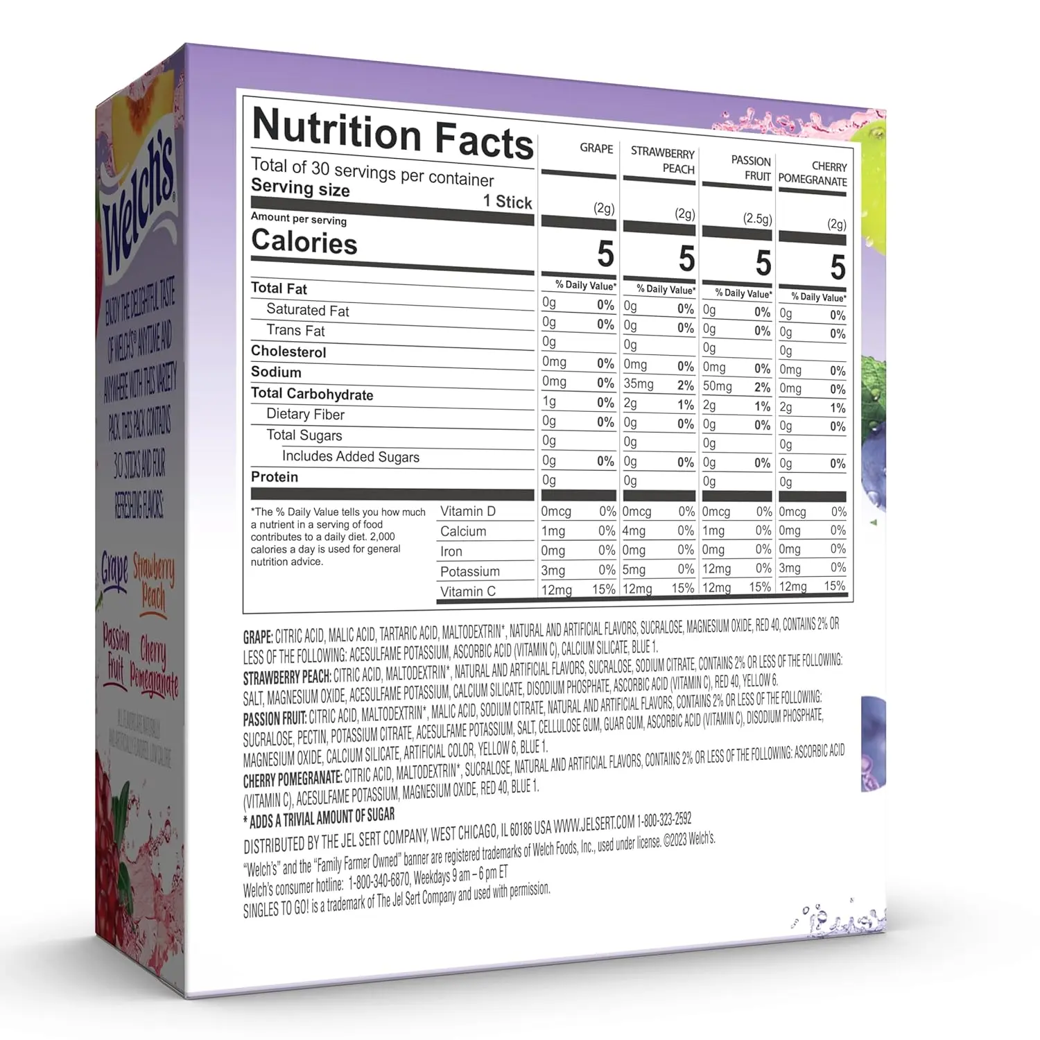 ·You know Welch's for their farmer owned and family grown juices and snacks, and now you can turn your water into delicious tasting Welch's flavors with Welch's Singles To Go! Juice drink mix. With several fun flavors to choose from, it's easy and convenient to boost the flavor of your water anywhere you are. The portable singles to go drink mix packet size make them ideal for packing in lunches or taking them with you in a hurry. Welch's Singles To Go! Juice drink mix is aspartame free and low calorie. Simply mix one stick with water for a refreshing and flavorful beverage that bursts with fruity goodness. Whether you're at work, school, or out and about, Welch's Drink Mix provides a convenient and delicious option to stay hydrated and energized throughout the day.