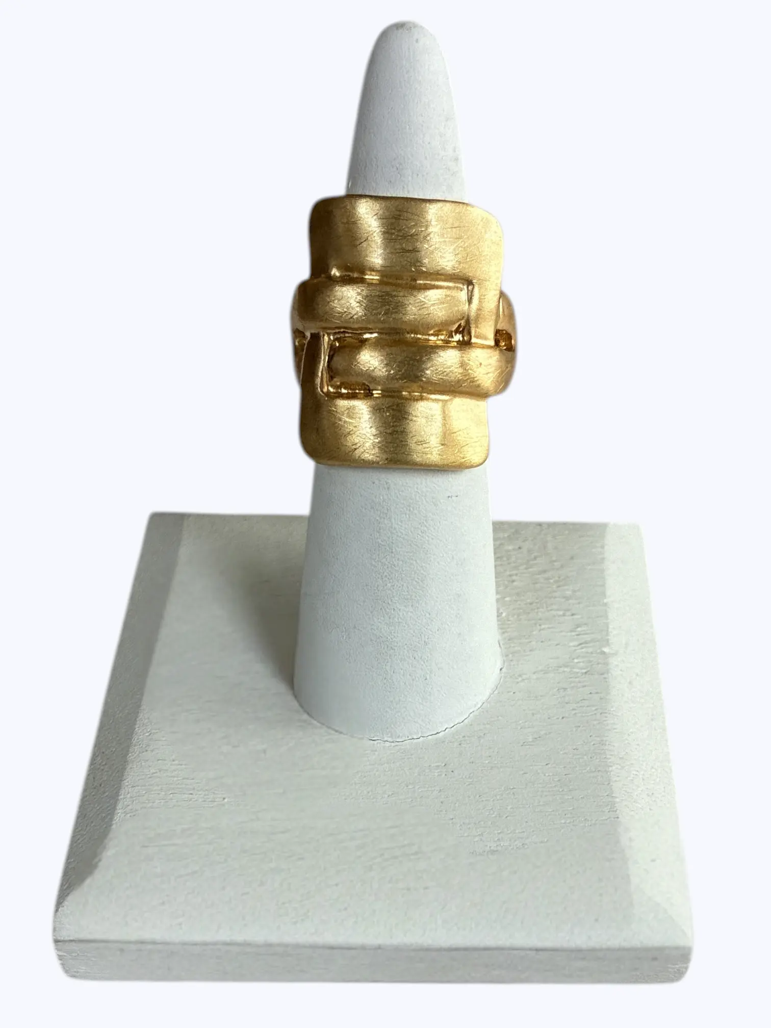 This sculptural wrap stretch ring is a bold boutique piece featuring a fluid, folded design that creates depth and movement from every angle. Crafted with a flexible elastic band, it offers a comfortable, adjustable fit that accommodates various sizes, making it ideal for gifting and easy retail sales. Its contoured, wrap-like structure gives it a modern, artistic appeal while maintaining a wearable balance between boldness and sophistication. This ring performs exceptionally well in contemporary and statement-focused displays, and pairs beautifully with other sculptural or fluid-form accessories for a cohesive, high-impact merchandising presentation.