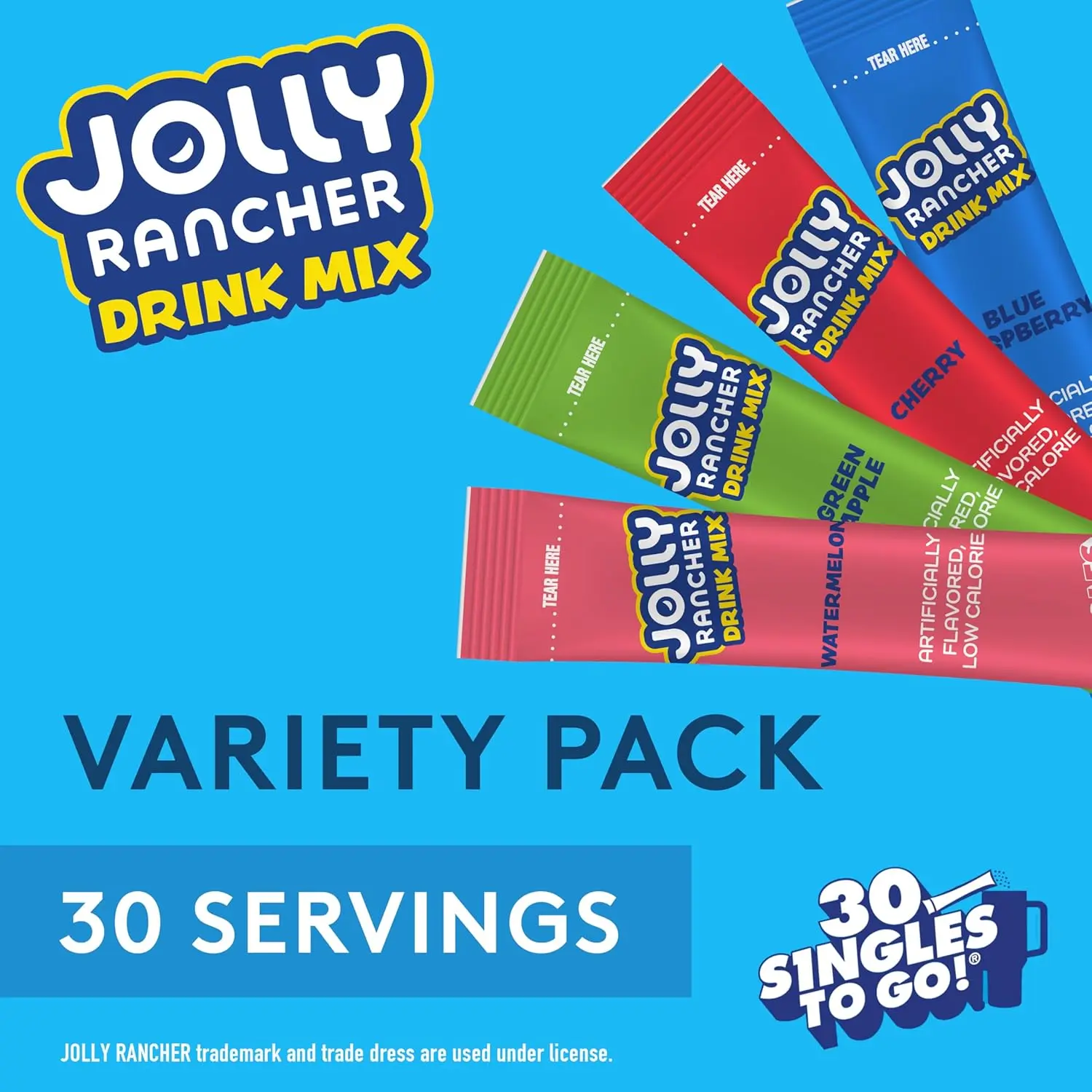 ·Jolly Rancher Singles To Go Variety Pack, Powdered Drink Mix, Zero Sugar, Low Calorie, Includes 4 Flavors: Green Apple, Blue Raspberry, Cherry, Watermelon, 1 Box (30 Single Servings)