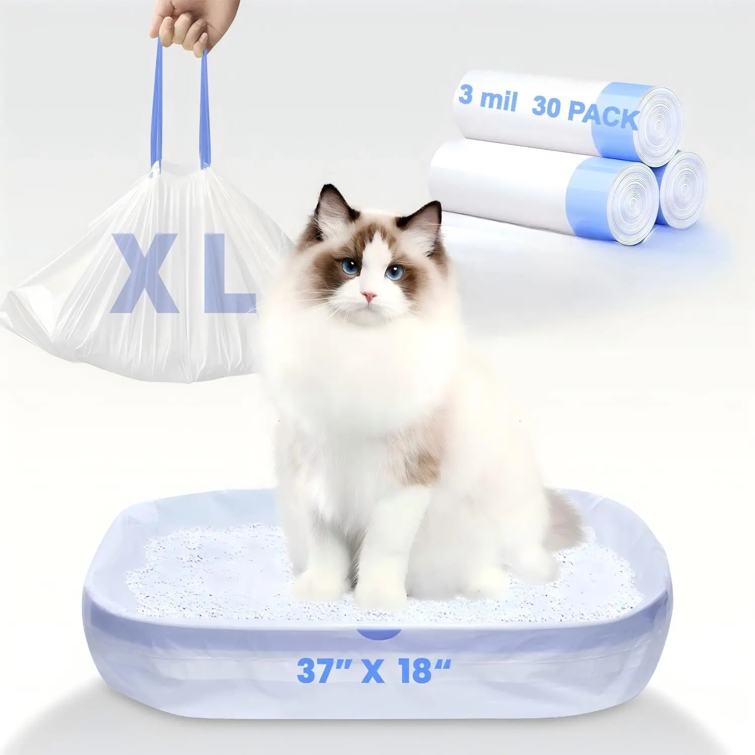 Our cat litter bags feature sturdy drawstring handles for easy handling.Easy tear process design, folded and rolled up, ready to use. Just lift, knot, and toss, keeping your hands clean and your home tidy.