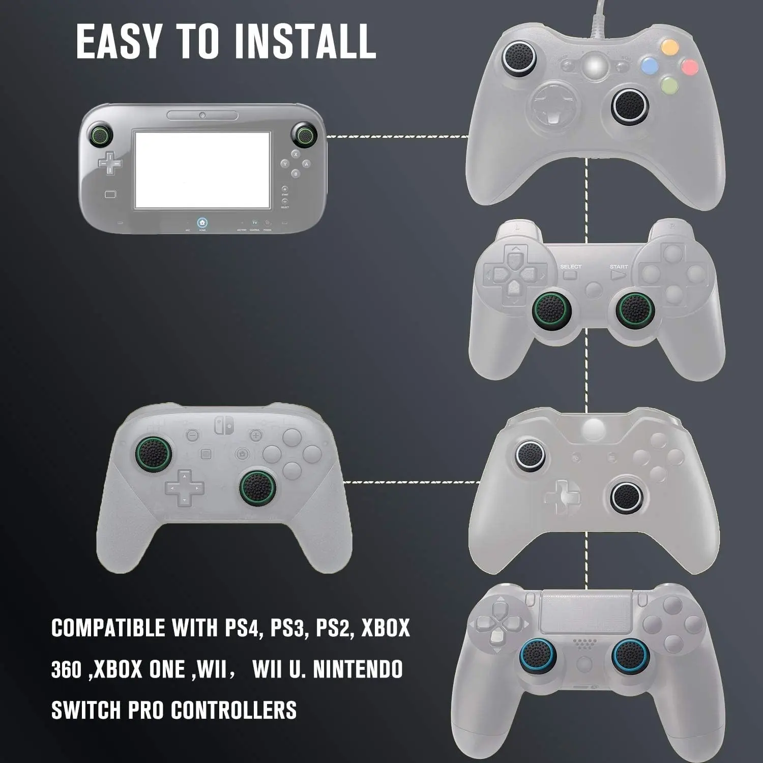 These caps are made of premium silicone for better grip and comfort. They are compatible with Sony PS4, PS3, PS2, Microsoft Xbox 360, Xbox One, Wii U, and Wii Nunchuk controllers. No tools or wires are required for installation. Simply flip the cap inside out and wrap it around the analog sticks.