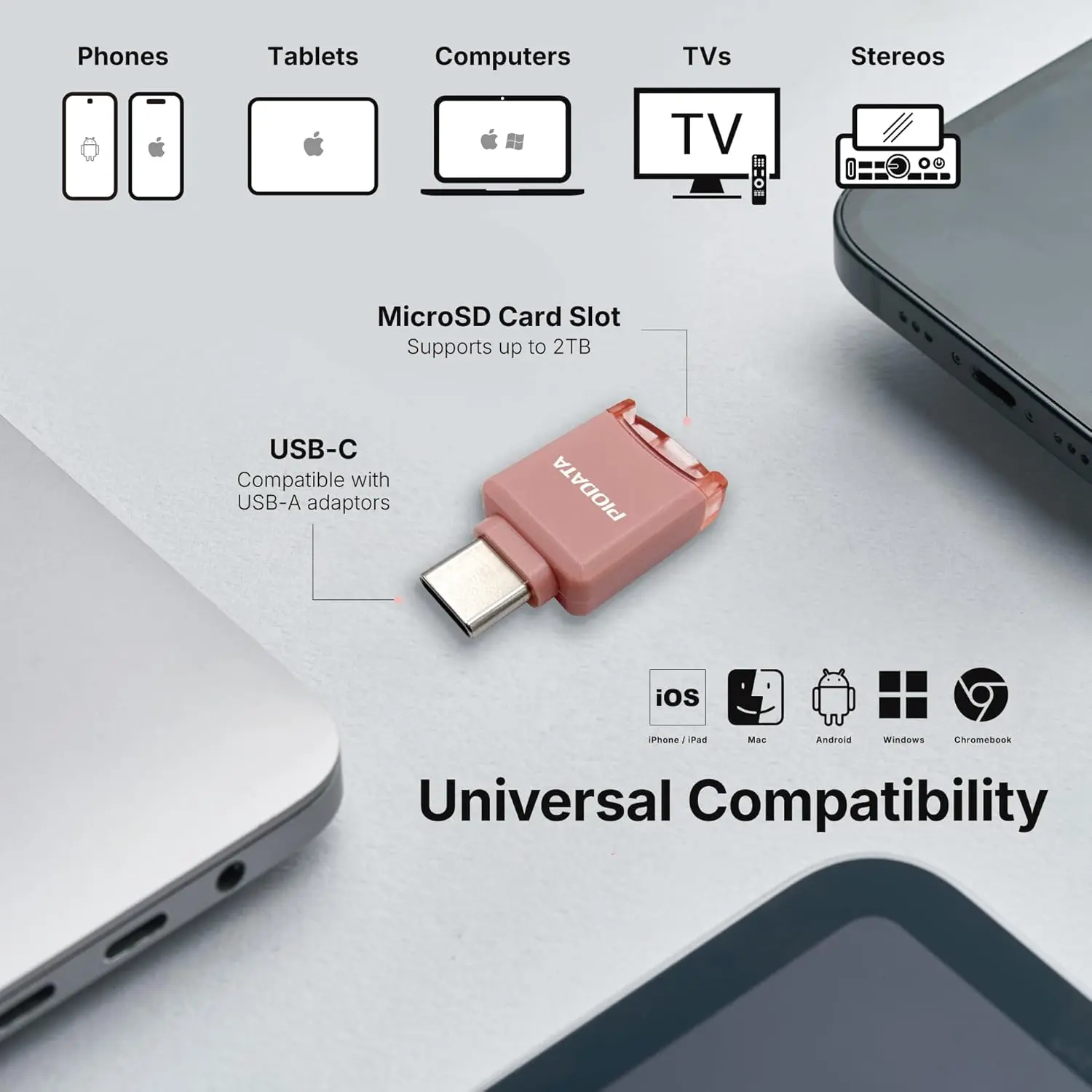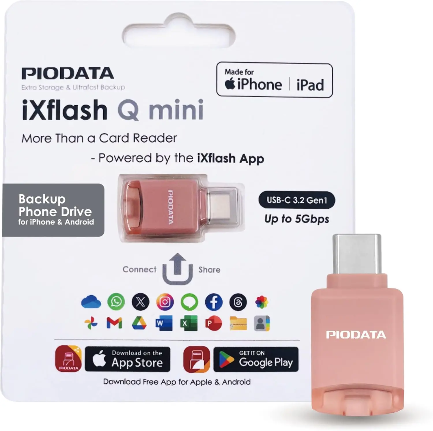 The PioData iXflash Q mini (Pink Edition) is a compact USB 3.2 Gen 1 flash drive with a built-in MicroSD card reader, designed for fast backup, storage, and file transfer across iPhone, iPad, Android devices, tablets, and computers. Ideal for women and users who prefer a stylish, modern accessory, it combines performance with a sleek pink design.
