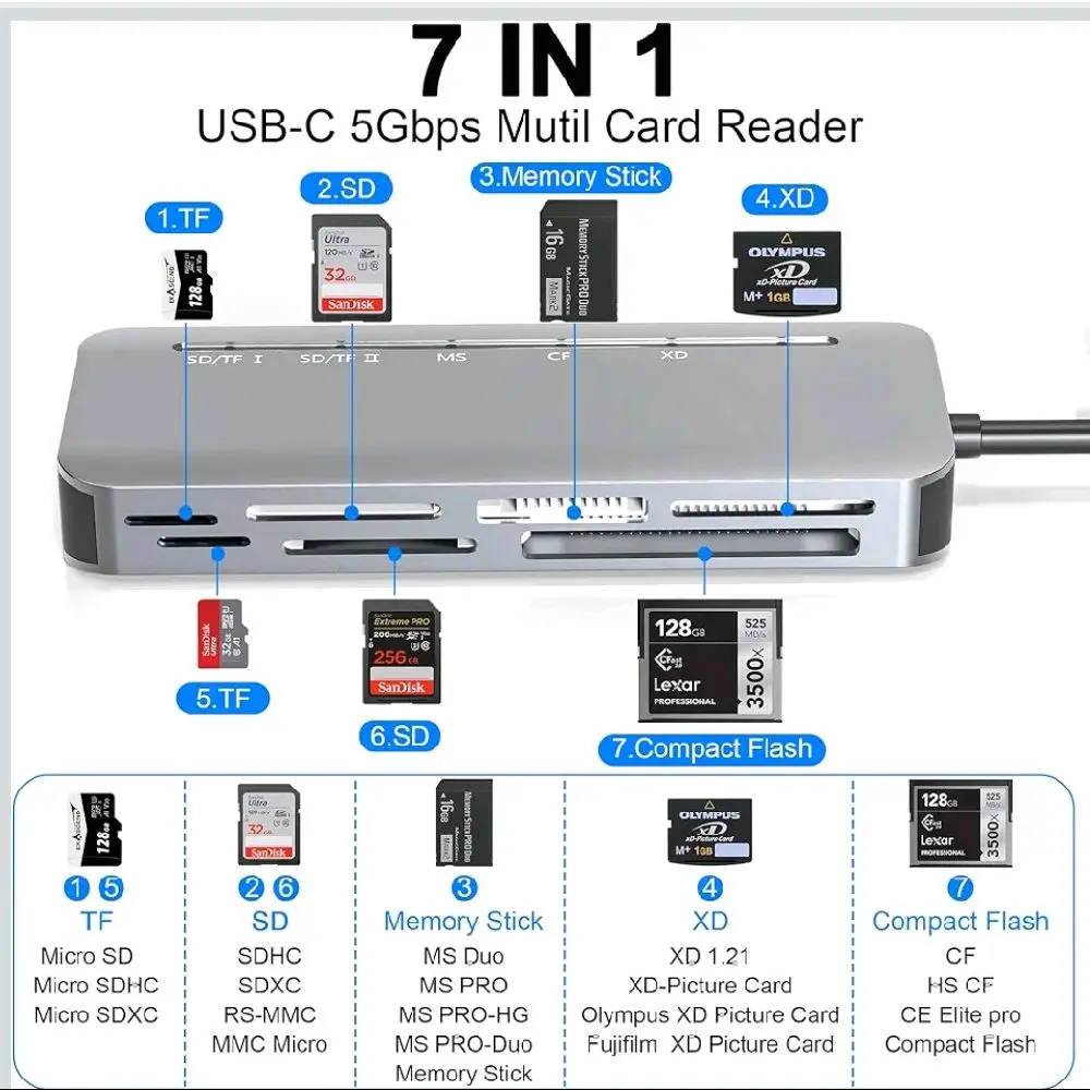 This adapter supports 7 different memory card types, making it a versatile tool for data transfer. Ideal for users with various memory cards, it simplifies the process of accessing and transferring files. The USB C connection ensures compatibility with modern devices. 📊