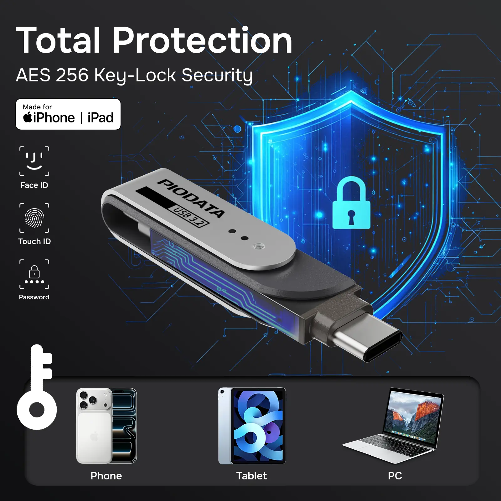 Advanced file management supports ZIP creation with password protection, PDFs, Word, Excel, PowerPoint, images, and videos. The extended Lightning connector works with most cases, and Trust Circle AES 256 encryption plus Read-Only mode keep your data secure.