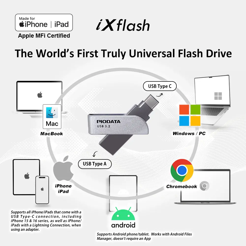 The PioData iXflash 128GB USB-A & USB-C flash drive is Apple MFi-certified and works with iPhone, iPad, computers, and more. Dual USB Type A and C connectors make it versatile for backups, file transfers, and media storage.