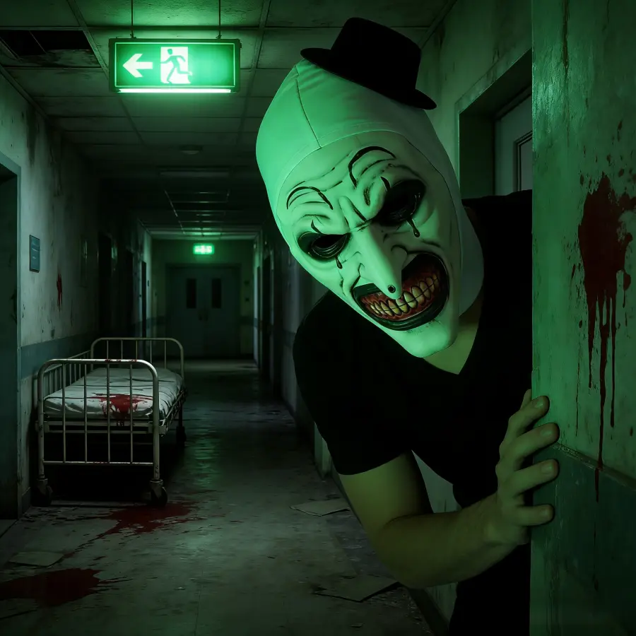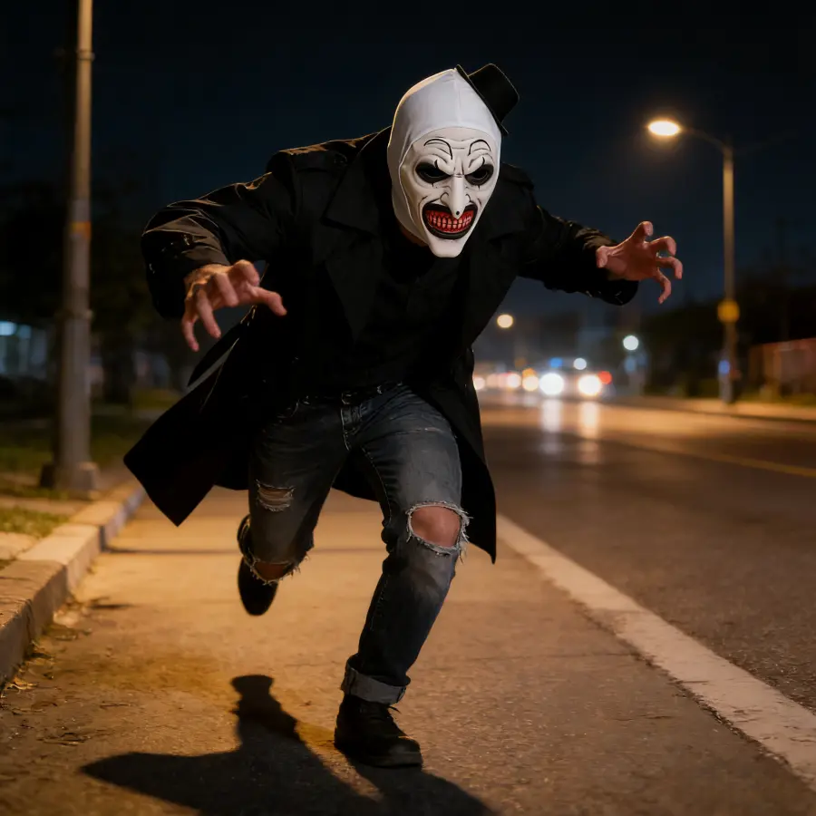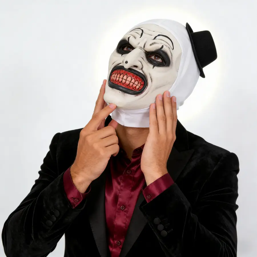 This full-head latex mask is a 1:1 recreation of the iconic image from the classic horror IP “Art the Clown.” Crafted with high-fidelity latex technology, it features a stark white hood, a black top hat, exaggerated black eye makeup, a long hooked nose, an open mouth, and densely packed sharp red teeth, maximizing its terrifying effect. It’s the perfect eye-catcher for Halloween and horror-themed parties, providing an immersive character experience!