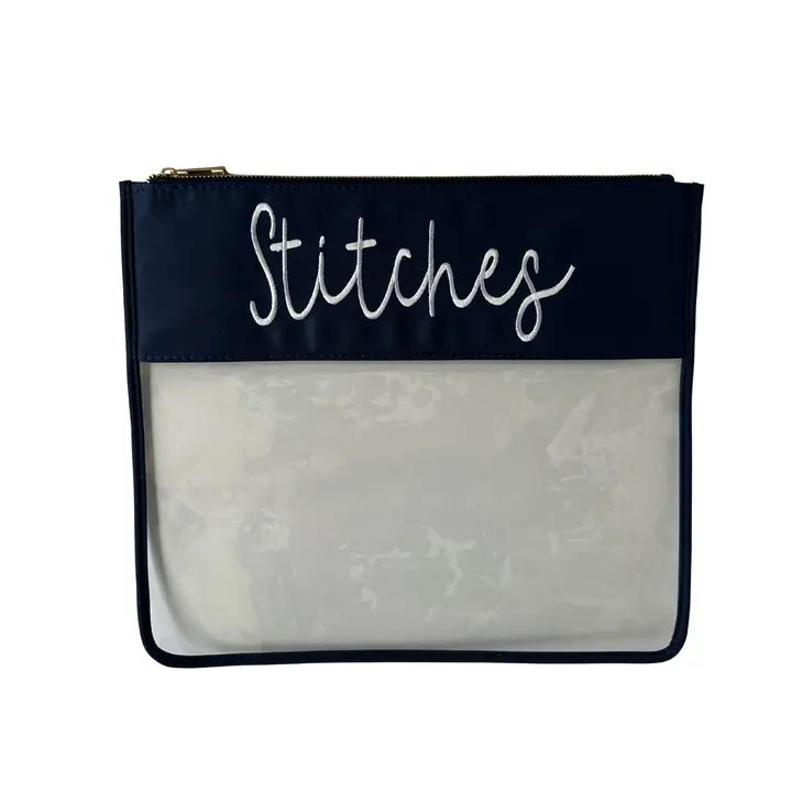 • White Embroidered "Stitches", Navy Bag- A charming touch for every stitcher.