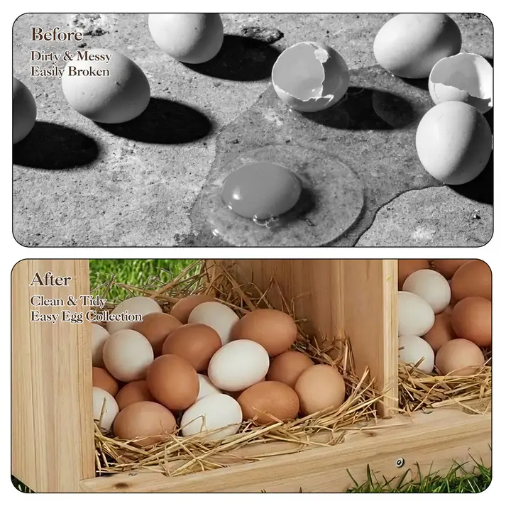 【 Egg-Roll-Proof & Easy Collection】: Features a clever angled design that gently rolls eggs toward a secure collection area. This mechanism prevents eggs from being stepped on or soiled, minimizing breakage and ensuring you gather clean, fresh eggs every morning.