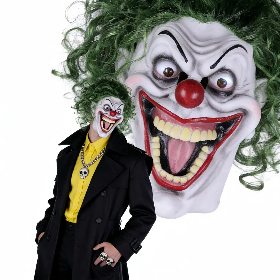 This full-head latex mask perfectly recreates the iconic image of the classic clown. Made with natural latex, it features a fluffy, curly green wig, a stark white face, exaggerated black eyebrows, and the signature round, bright red nose, paired with an open mouth and perfectly aligned yellow teeth. It radiates a powerful sense of madness and terror, making it a must-have for Halloween and horror-themed parties, providing an immersive role-playing experience!