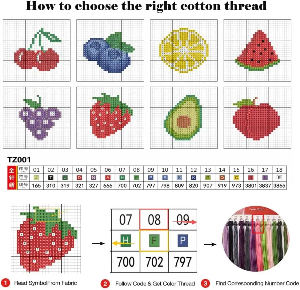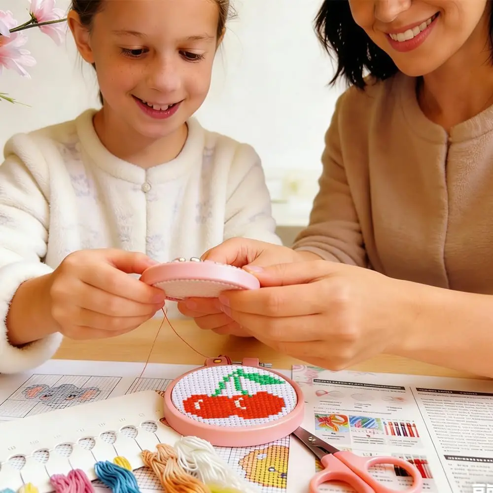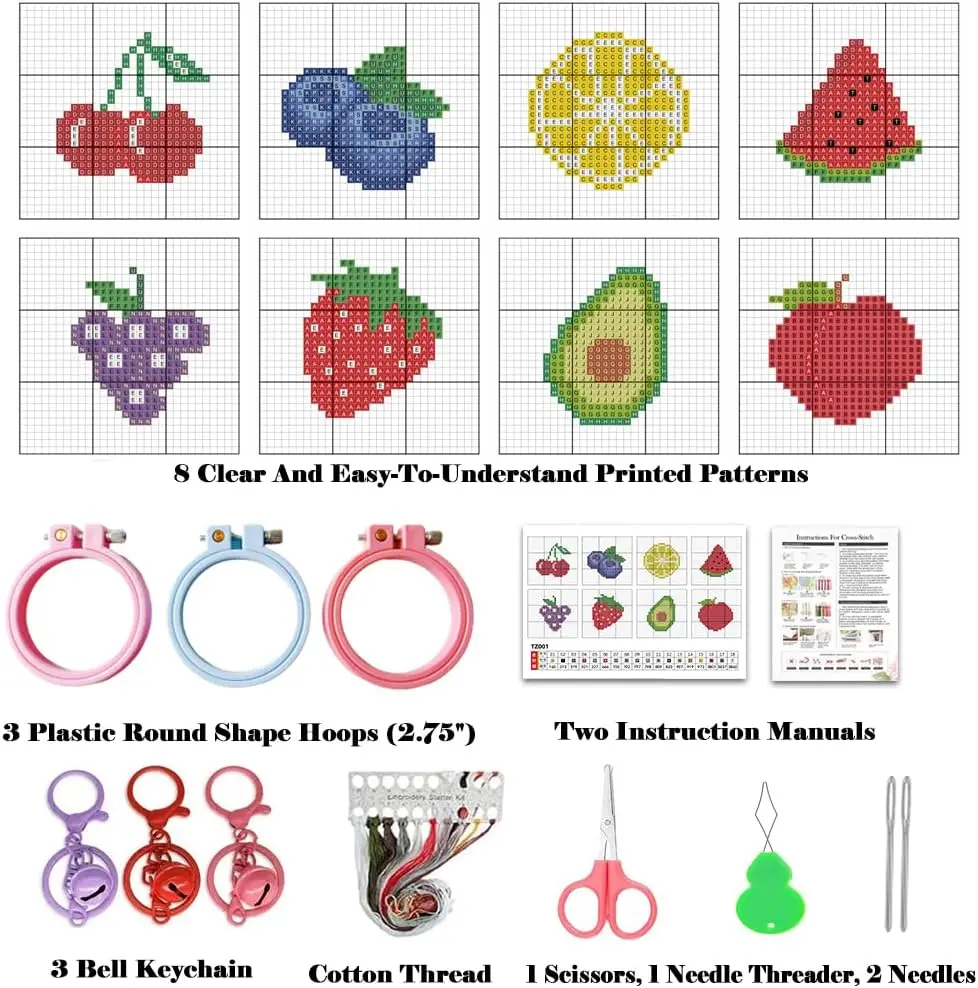 ·【Cross Stitch Kits】 8 pre-printed patterns that kids love Cherries, blueberries, lemons, watermelons, grapes, strawberries, dragon fruit, peaches).3 Plastic Round Shape Hoops(2.75"),3 Bell Keychain,1 Set Cotton Thread,1 Scissors,1 Needle Threader,2 Needles,Two Instruction Manuals.