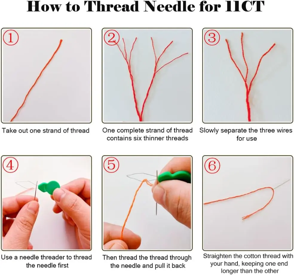 ·11CT requires 3 strands of thread to complete the embroidery Each line we provide consists of 6 strands,so you will need to divide the 6 strands into 3 strands before working
