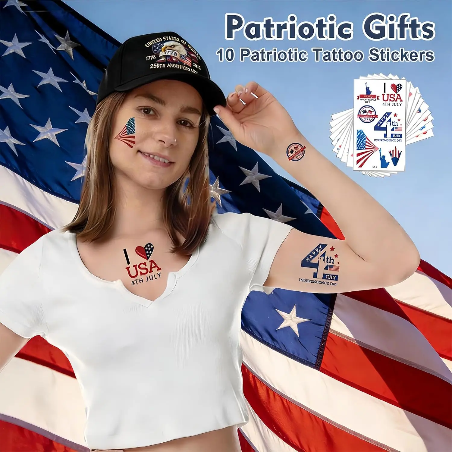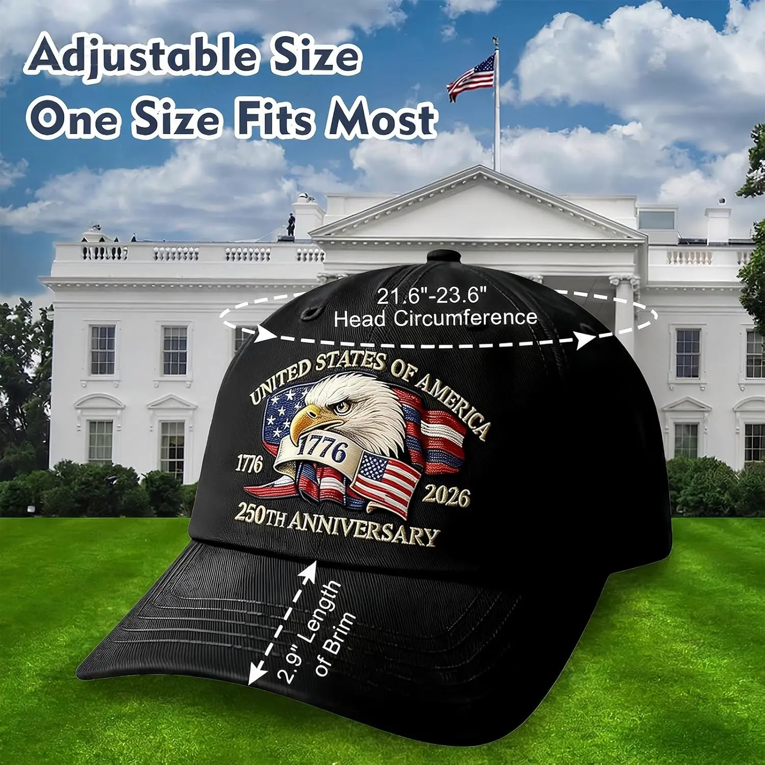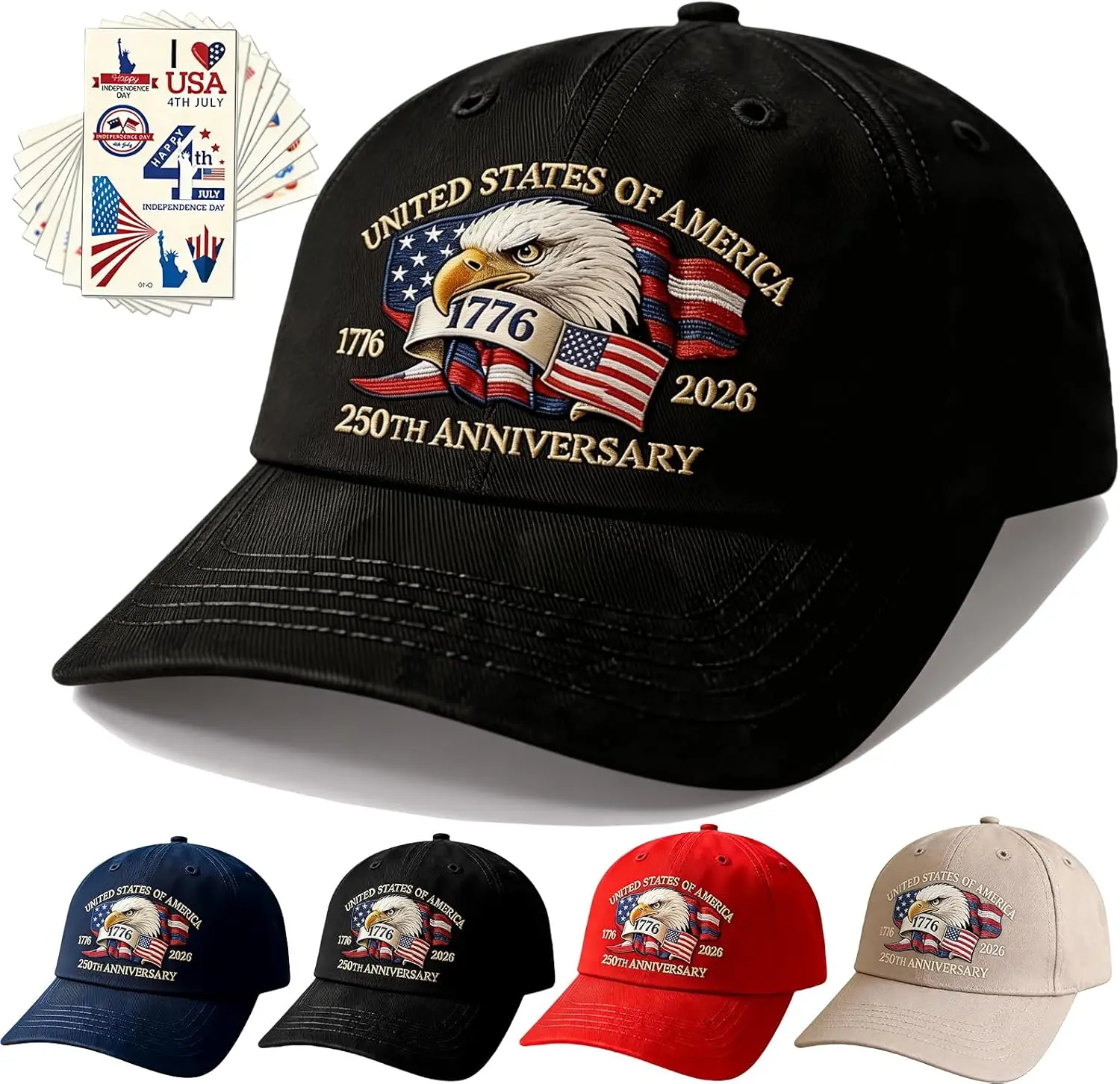 ·Bokauo 250 Anniversary Usa Hat Includes 10 Tattoo Stickers:Honor the monumental 250th anniversary of the United States (1776–2026) with this collectible baseball cap. Using thermal transfer printing, the iconic American eagle, American flag, and "1776–2026" insignia are vividly showcased. This 250 anniversary USA hat is more than an accessory—it’s a wearable tribute to America’s history, making it a standout piece of 250 anniversary usa merchandise.