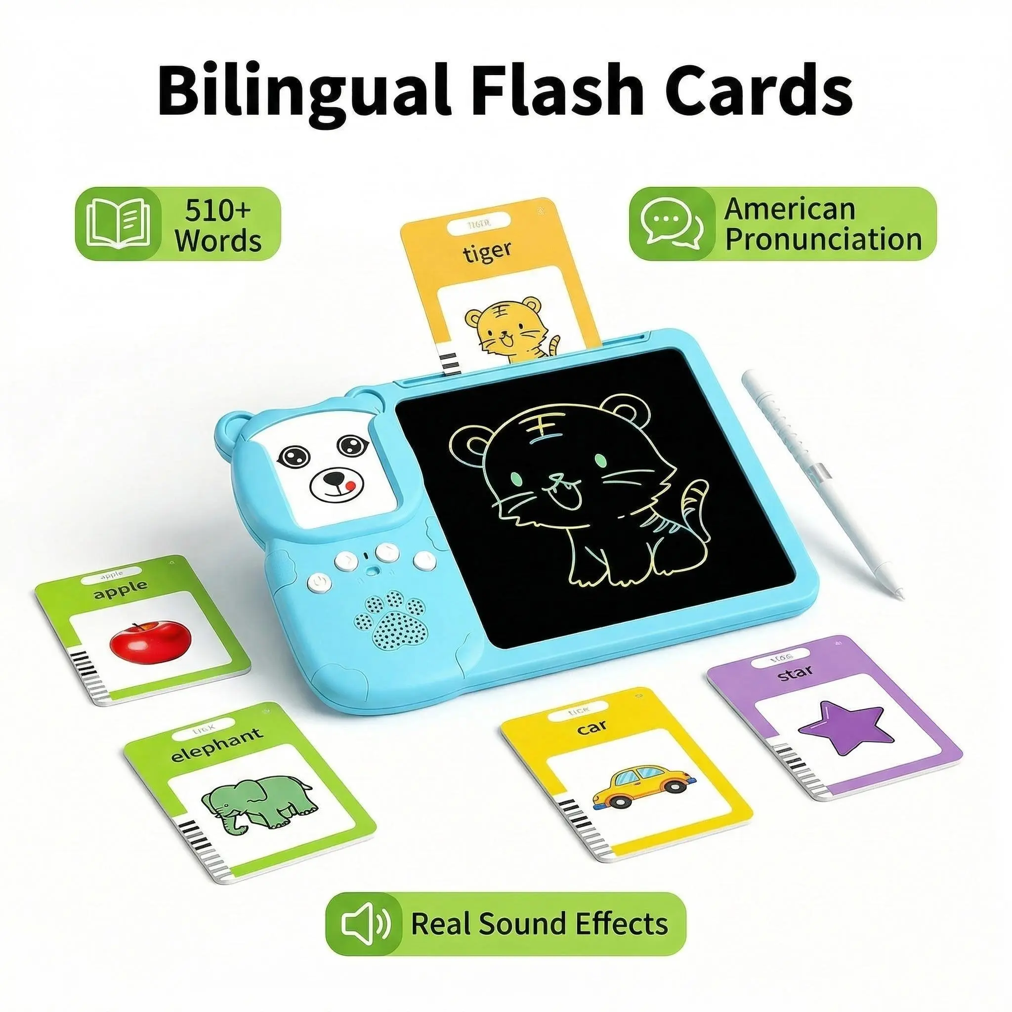 Explore over 510 high-frequency vocabulary words covering animals, fruits, family, transportation, and shapes. Aligns with everyday scenarios familiar to American families. Insert a card for authentic American pronunciation and realistic sound effects. Double-sided cards encourage fine motor skills, promoting interactive learning. 📚