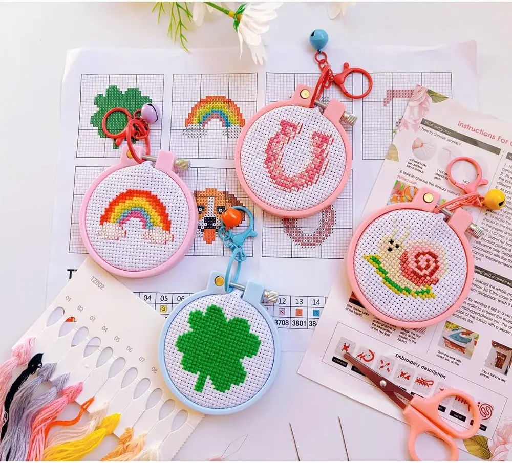 ·【Cross Stitch Kits】 8 pre-printed patterns that kids love (Four-leaf clovers, rainbows, rabbit paws, the number 7, snails, puppies, horseshoes).3 Plastic Round Shape Hoops(2.75"),3 Bell Keychains,1 Set Cotton Thread,1 Scissors,1 Needle Threader,2 Needles,Two Instruction Manuals.