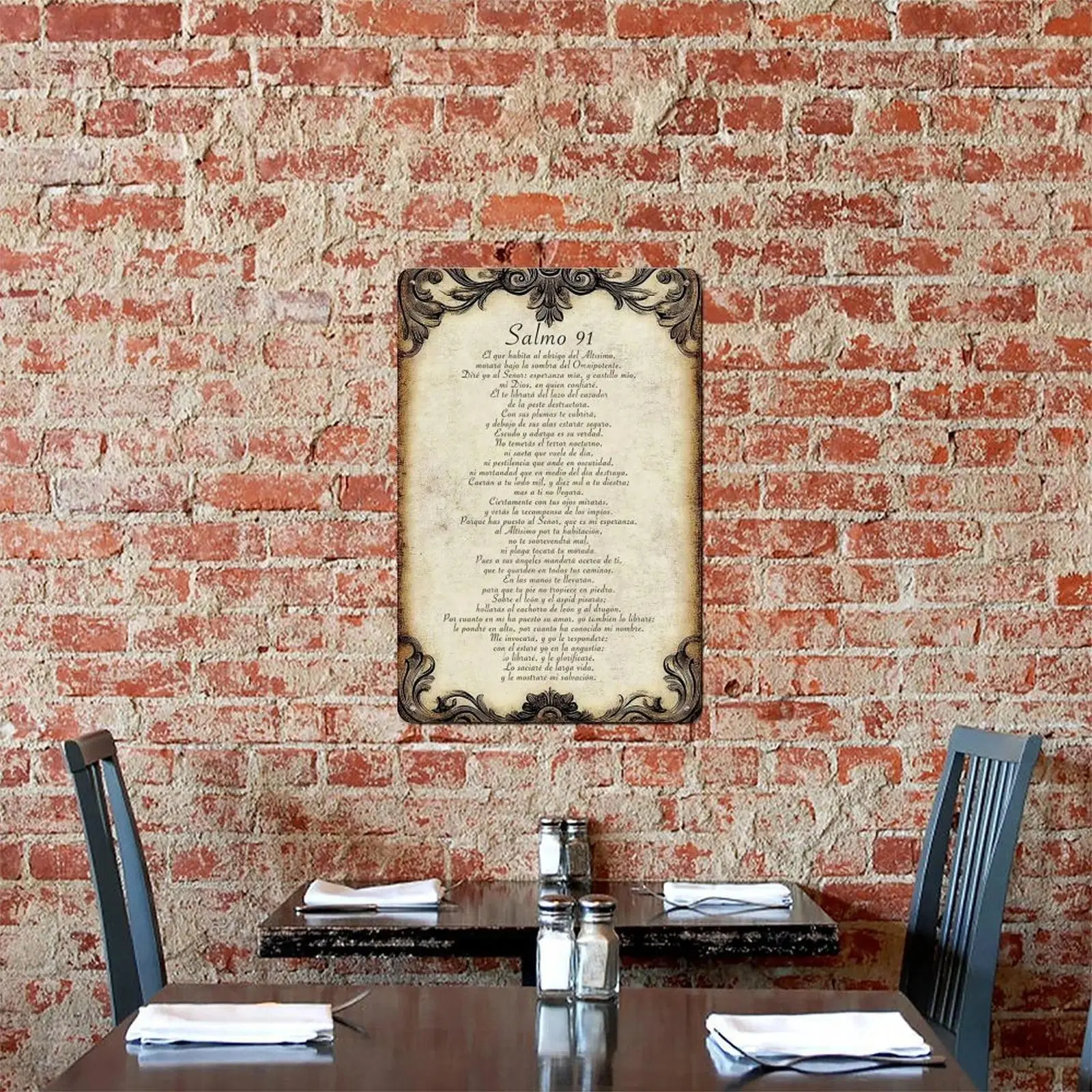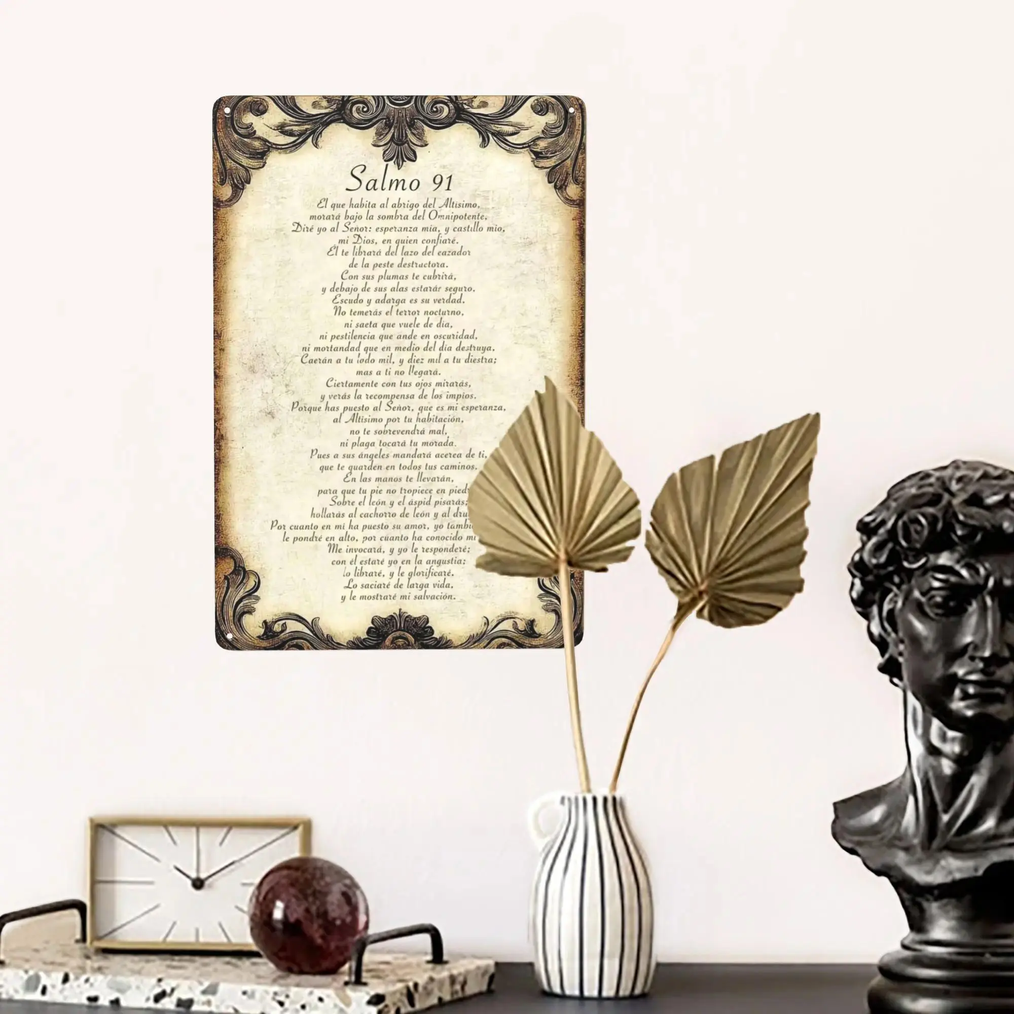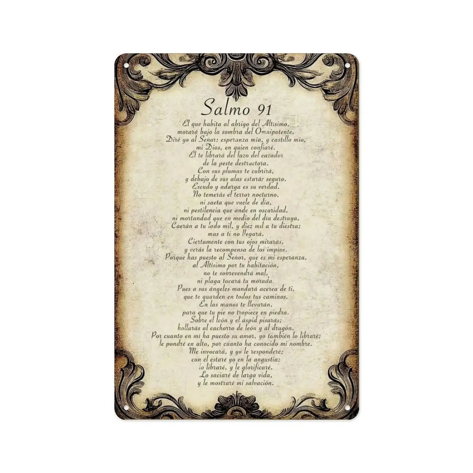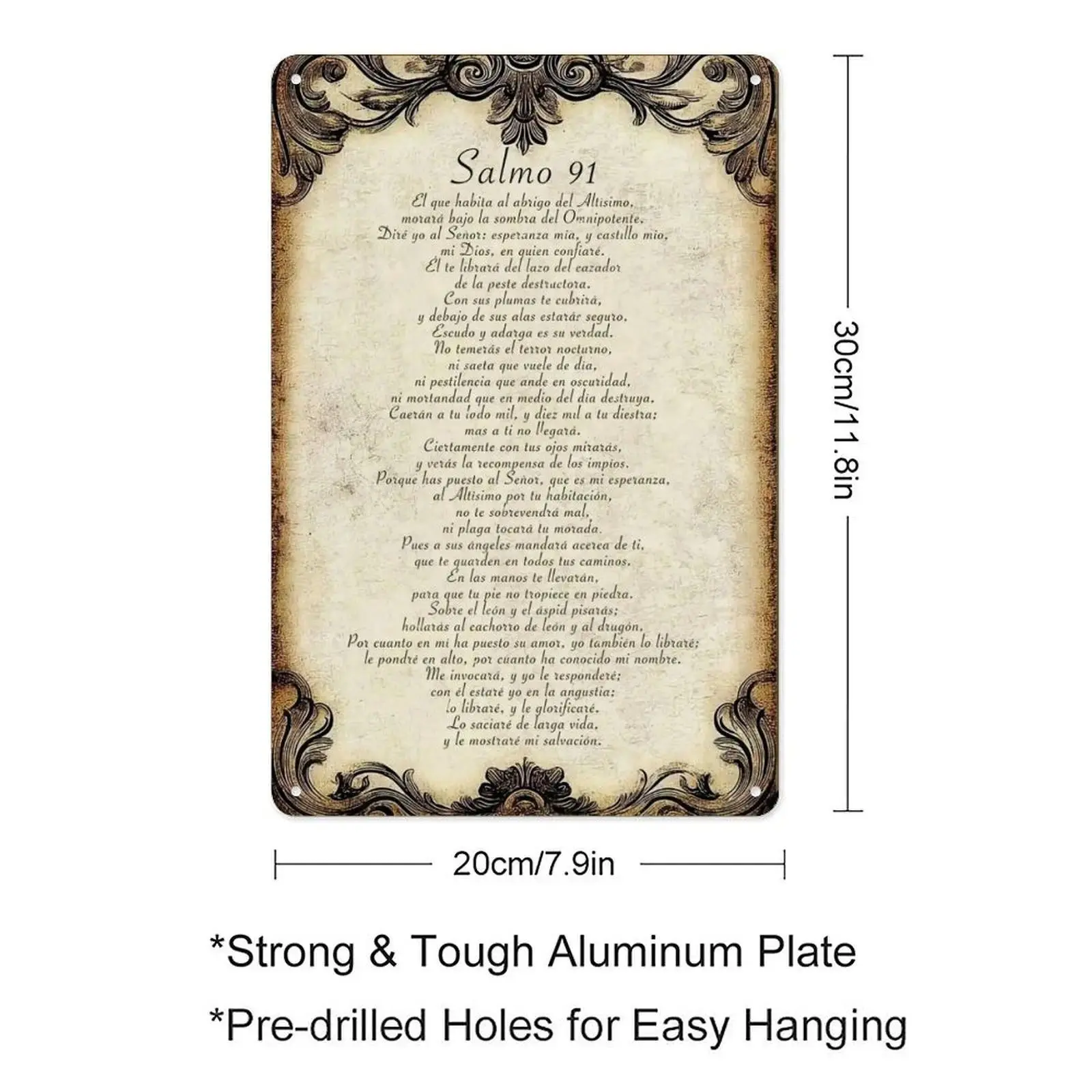 Why This Sign Is A Source of Strength for Spanish-Speaking Faithful Durable & Timeless : Rust-proof aluminum holds up indoors and outdoors-sun, daily stress, or quiet moments won’t fade this sacred Spanish-language Psalm 91 text. Vintage, Elegant Vibes : Distressed parchment-style background + ornate filigree borders and classic script create a reverent, comforting feel perfect for prayer and reflection. Easy to Hang : Pre-drilled corner holes let you mount it on prayer nook walls, bedroom accents, or entryway shelves in seconds (hardware not included). Fade-Proof Print : The full "Salmo 91" text stays crisp for years-no peeling, even as it becomes your go-to source of protection and peace. Perfect For These Spaces Home prayer corners, bedroom accent walls, or living room shelves Spanish-speaking church small group rooms, or gift for anyone deepening their faith Nursing home rooms, hospital chapels, or spaces for quiet reflection Kitchen walls (a quiet reminder of divine protection during daily routines) Care Tips Wipe clean with a dry/damp cloth-do not submerge in water. What You Get 1 x "Salmo 91" Aluminum Sign