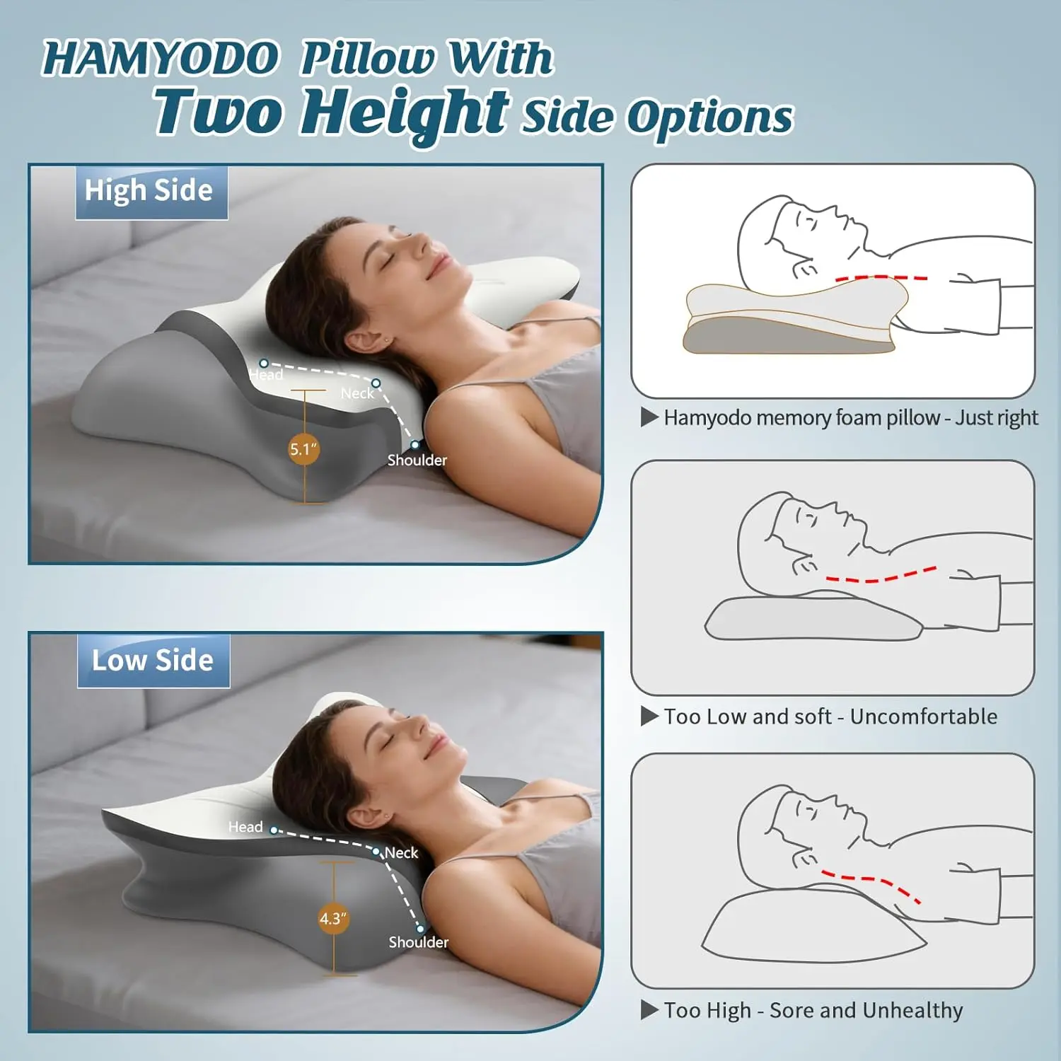 ·【BETTER SLEEP ENHANCEMENT WITH SIDE SLEEPER PILLOW】Innovation Fishtailed shape sleeping technology for better & healthier sleeping time with 2 height(5.1/4.3”). Cervical neck pillow for sleeping with personalized design for customized comfort while sleeping.Your Perfect Fit in One Contour Pillow: One size does NOT fit all. That's why we offer a versatile dual-height design. Simply flip the pillow to choose between a medium-low or medium-high loft, giving you two pillows in one to perfectly match your sleep position and body type.