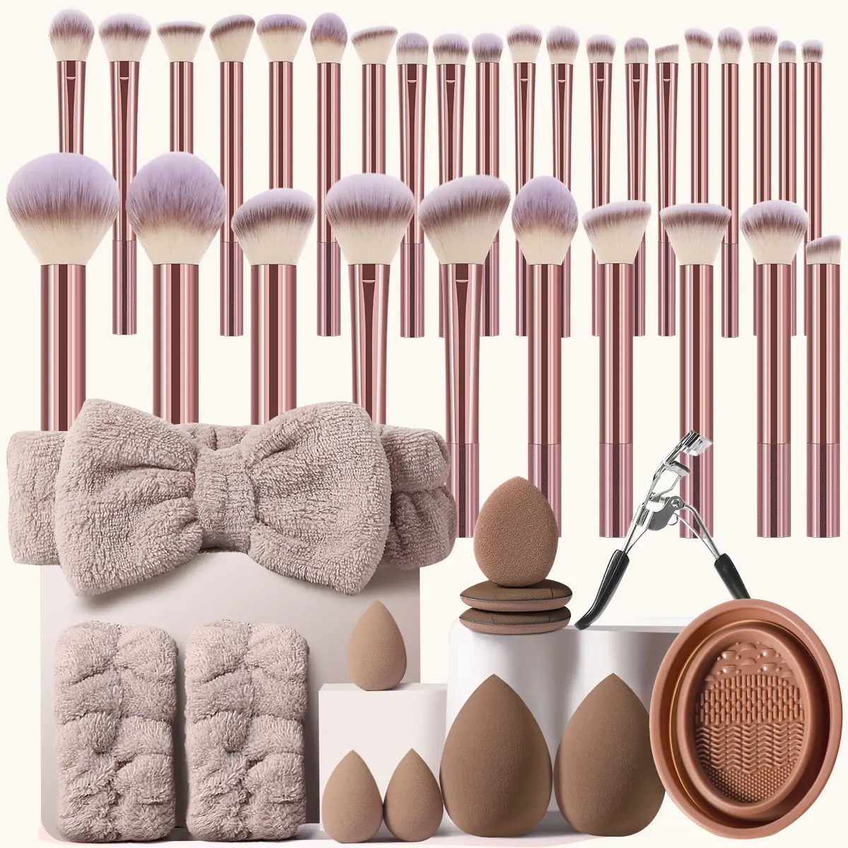 The set includes 30 high-quality makeup brushes with soft, dense synthetic bristles, ideal for foundation, eyeshadow, blush, concealer, and highlighter. It comes with 2 standard makeup sponges and 3 mini sponges for smooth, even base application, as well as 3 mini air cushion powder puffs for precise touch-ups and setting.