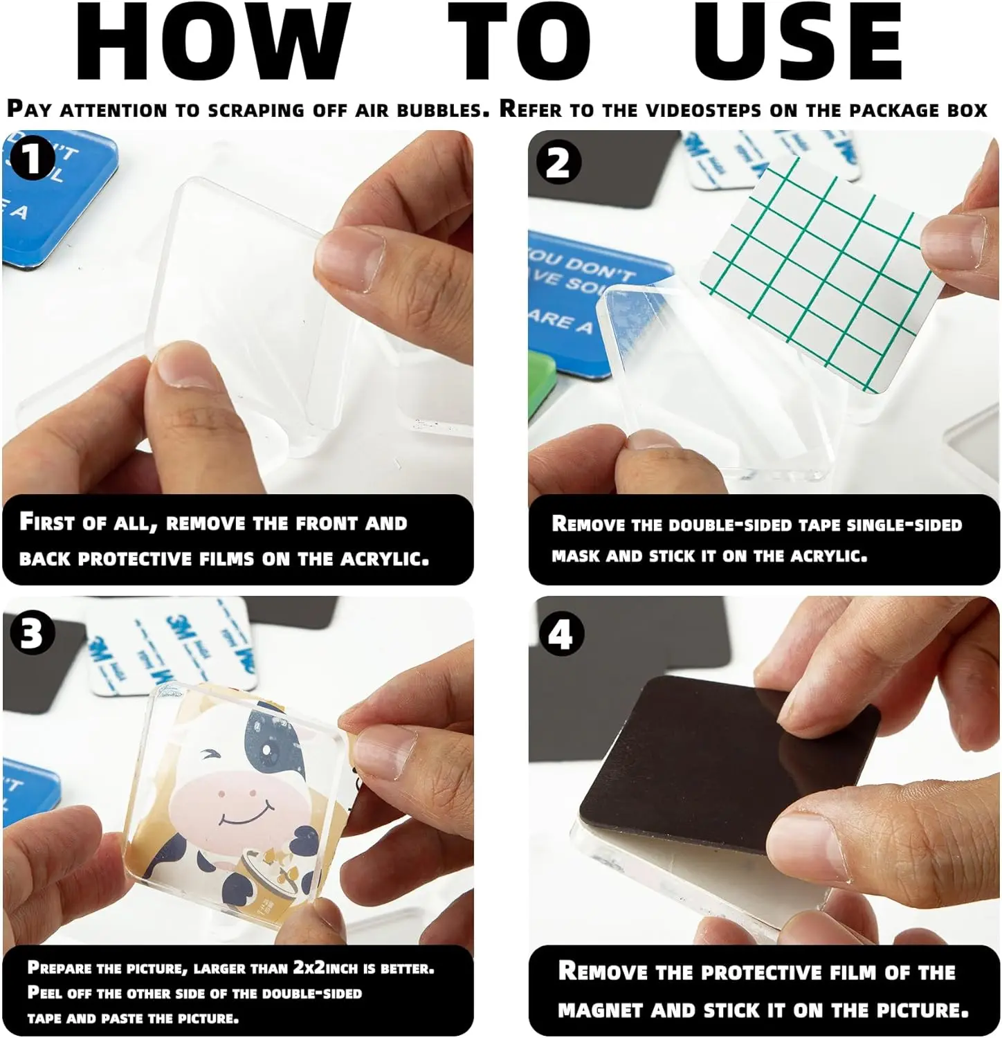 ·All-Inclusive DIY Kit:Includes 6 suqare acrylic(2*2*0.2"), 6 soft magnets(2*2*0.04"). Everything needed to create custom fridge magnets, organizers, or decorative crafts. Perfect for beginners and crafters alike, offering endless possibilities for home decor, organization, or gifts.