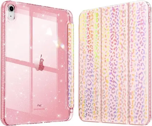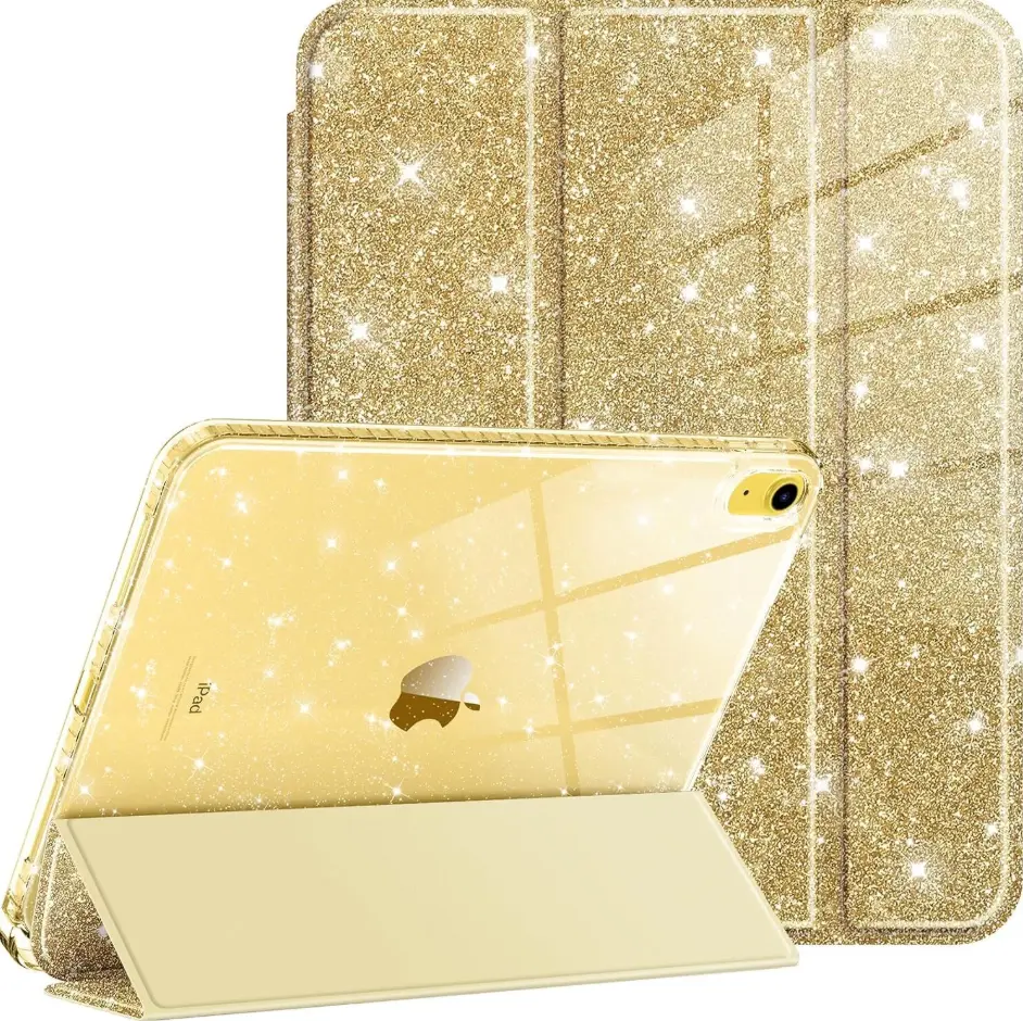 Your iPad is shielded from collisions, drops, and shocks by a hardshell rear cover with a flexible TPU bumper. The smooth PU leather is dust-resistant and easily cleaned, while the soft microfiber interior front guards against scratches. Your iPad will always sparkle brightly because to its inlaid crystal glitter, which never fades.