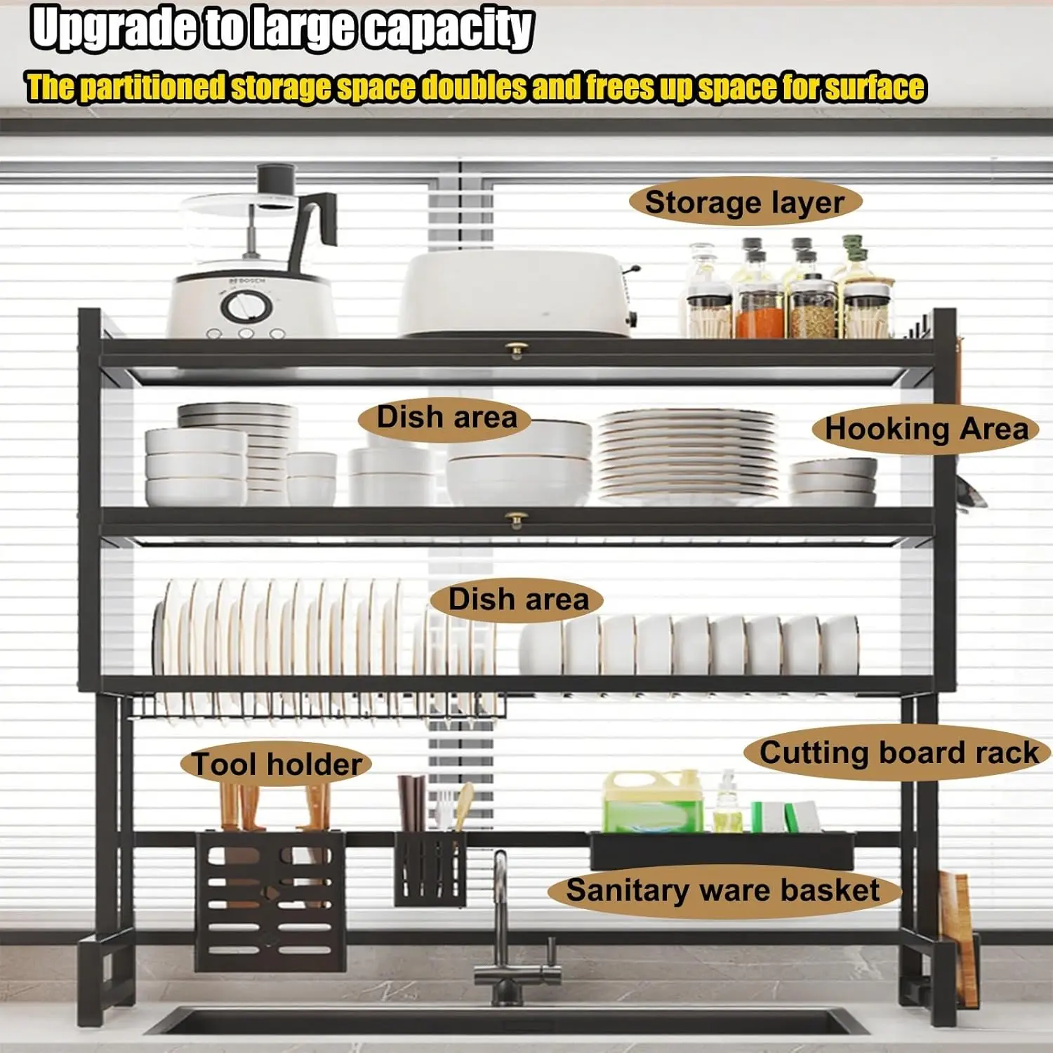 ·Double-tiered storage design frees up space and eliminates clutter: The intelligently designed double-tiered structure and drain rack fully utilize the vertical space above the sink to organize dishes, cutlery, and other items, eliminating clutter and creating a more spacious kitchen area for more comfortable and efficient cooking.