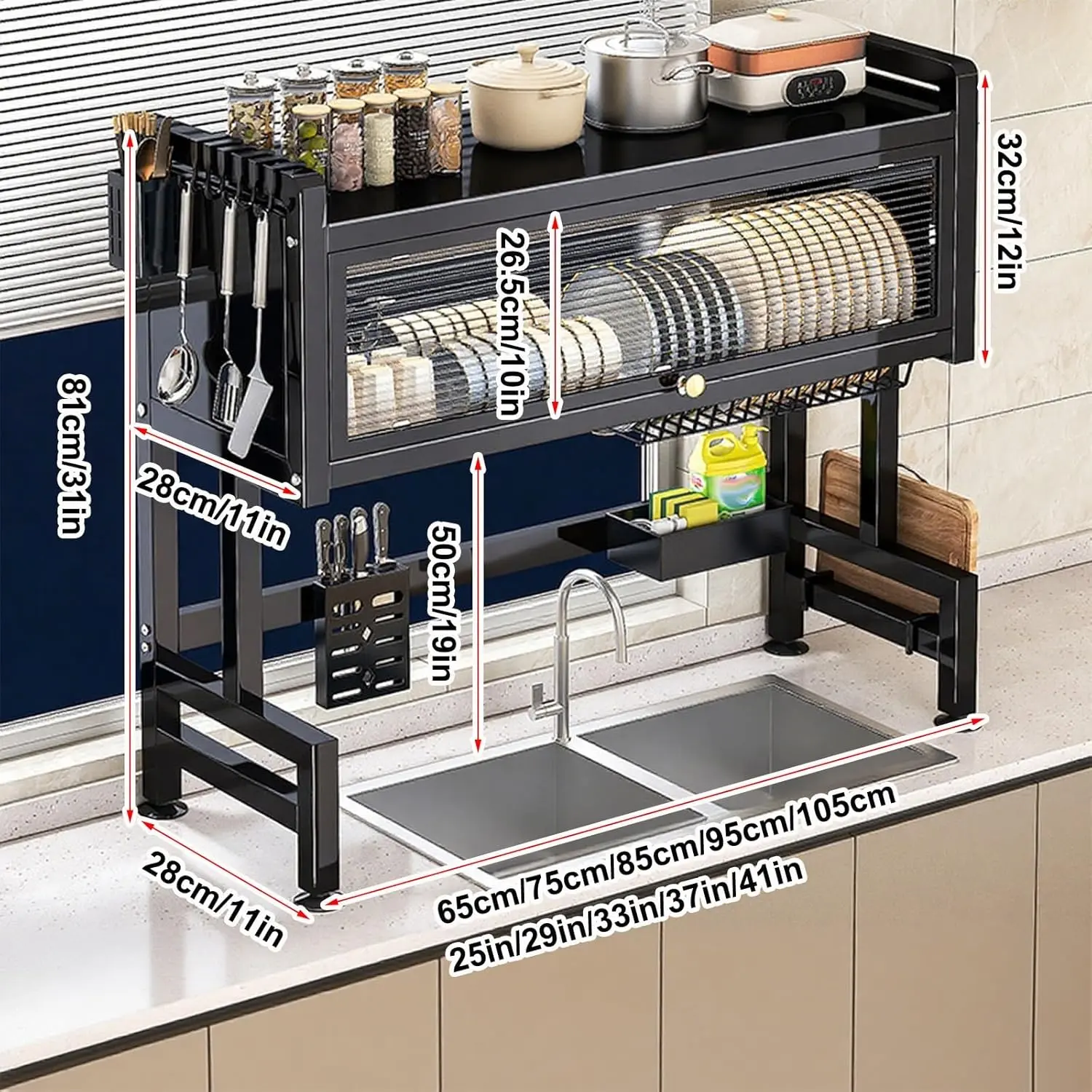 ·Upgraded acrylic doors for dustproof, visibility, and durability: This over-sink storage rack features transparent doors made of upgraded acrylic. Not only does it provide a clear view of the dish storage inside for easy access, but it also boasts a higher hardness than ordinary materials, effectively preventing dust and keeping kitchen utensils clean at all times, extending their lifespan.