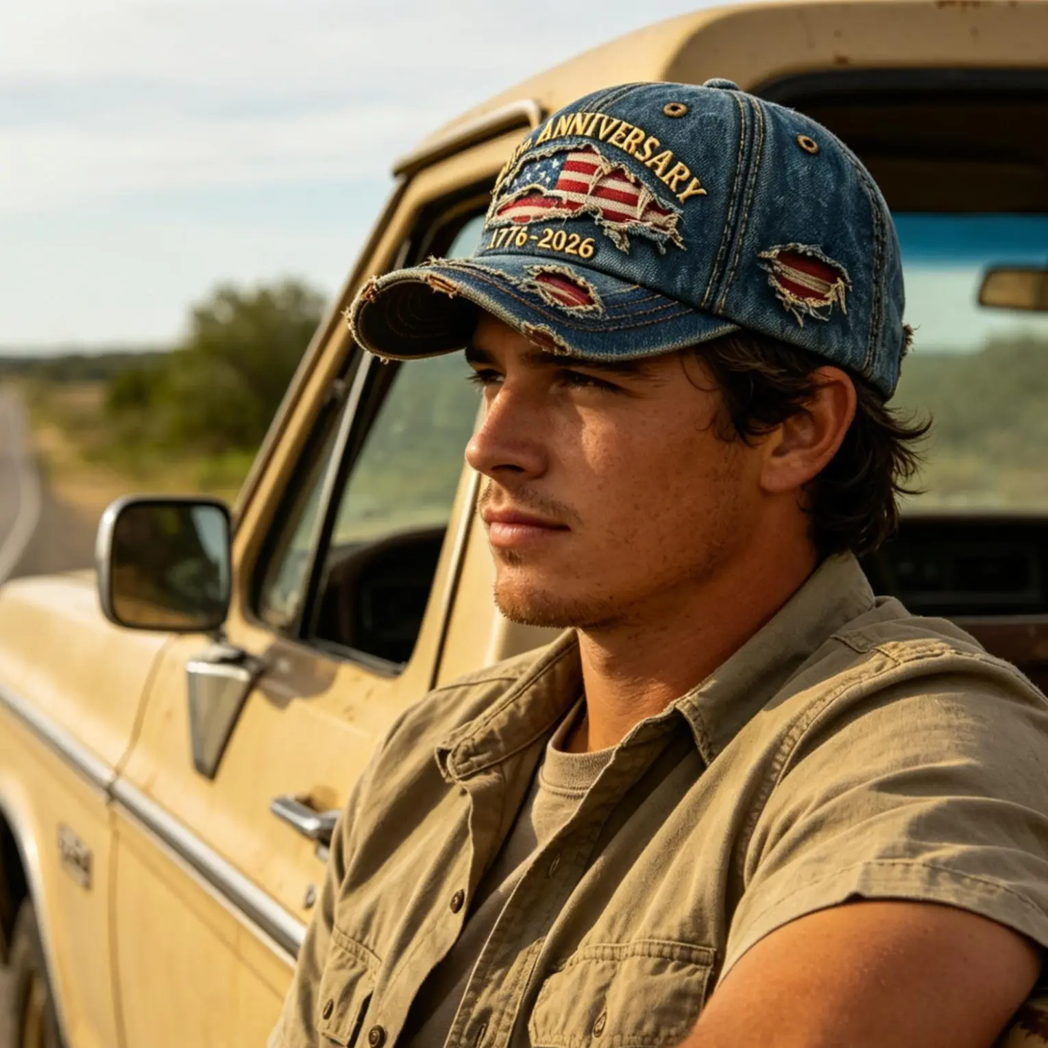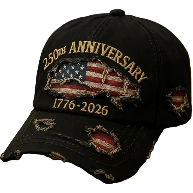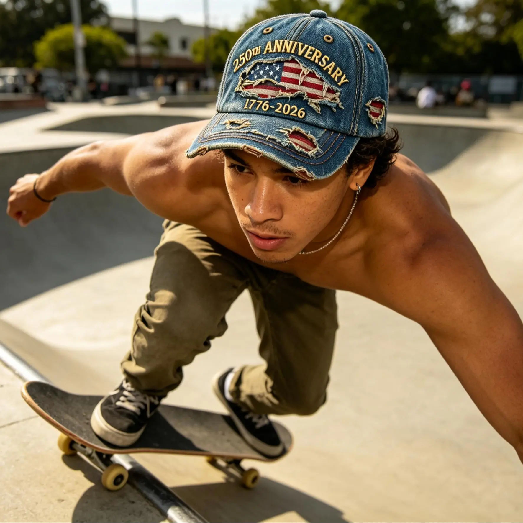 250th Anniversary Baseball Cap, USA 1776-2026, Patriotic Fashion Casual Style, Pairs well with ripped jeans and embroidered map of the United States.