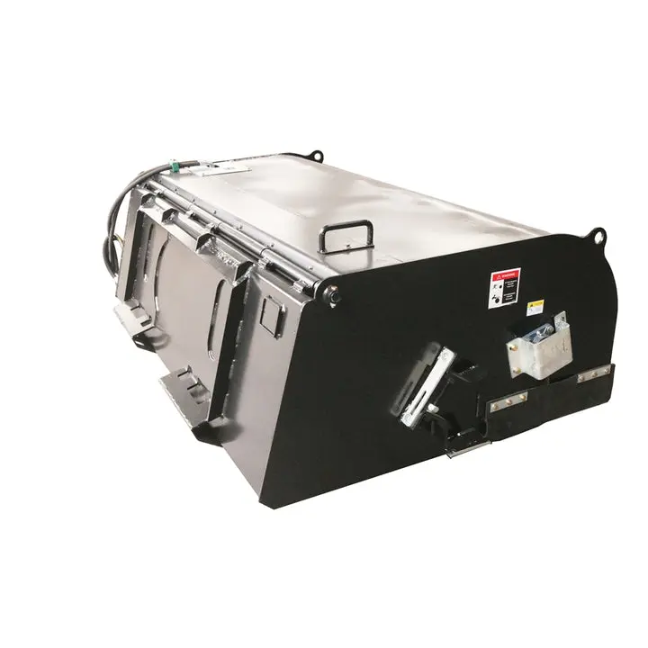 The Sweeper can sweep, collect and dump dirt and other debris in just one attachment. It is ideal for construction, industrial or municipal jobs. 21.6in diameter convoluted brush for effective sweeping action. Quick change brush without breaking hydraulic lines. Bi-directional broom sweeps forward to pick up dirt; reverses to collect rock and construction debris ect. It contains a bucket will hold considerably more debris volume with less recirculation when compared to conventional sweepers. To dump, just lift and tilt; no chains are required.