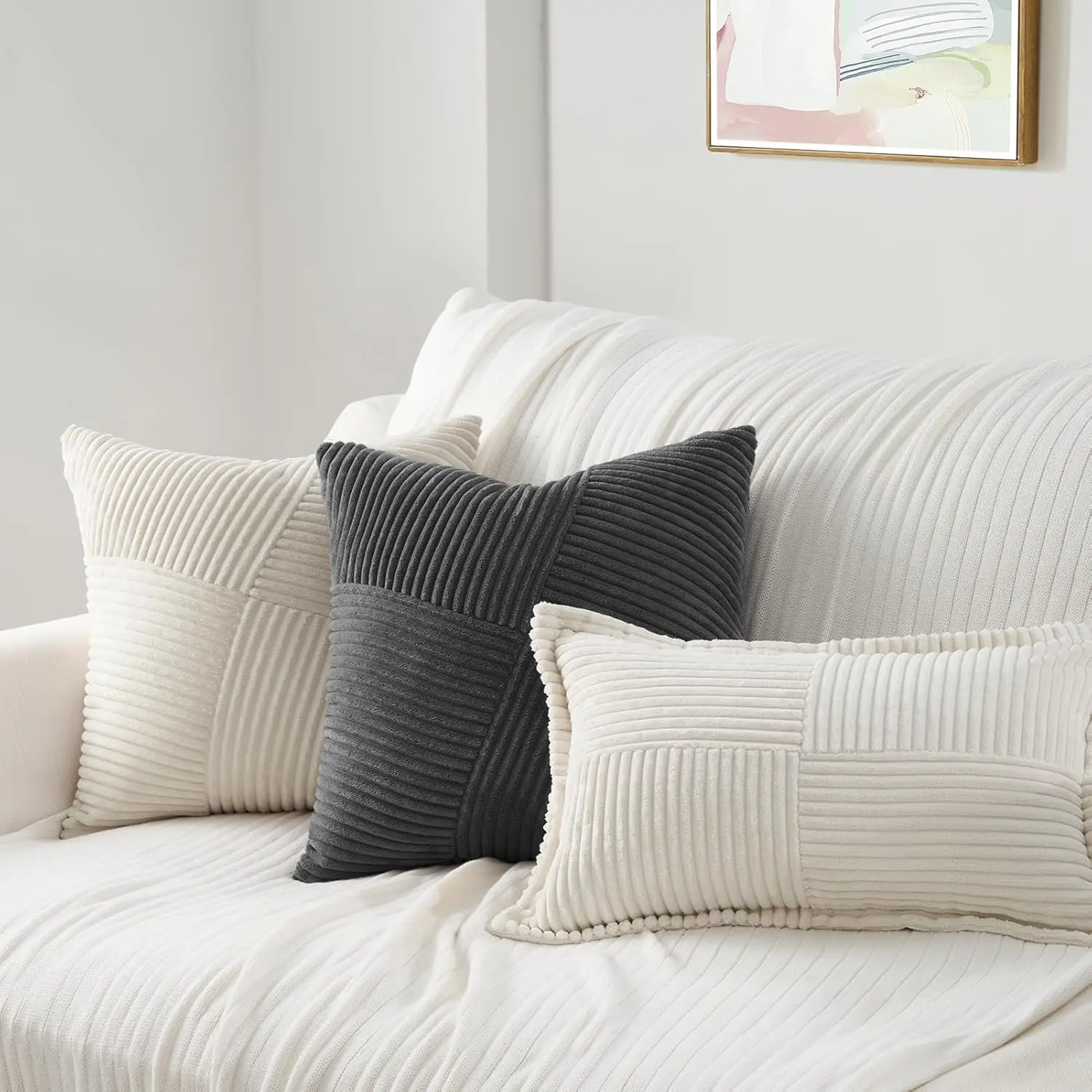2 Decorative Darkgrey Throw Pillow Covers 22x22 Inch Soft Corduroy Pillow Covers Boho Textured Striped Patchwork Cushion for Couch Sofa Bed Cute Home