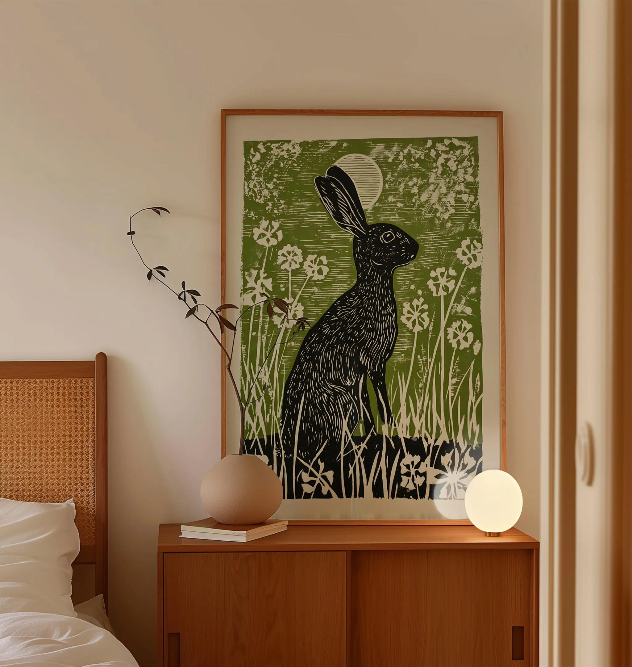 Hare in Moonlit Meadow Poster: Japanese Woodblock Style Art Print, Vintage Animal Wall Decor, Retro Nature Poster for Living Room
