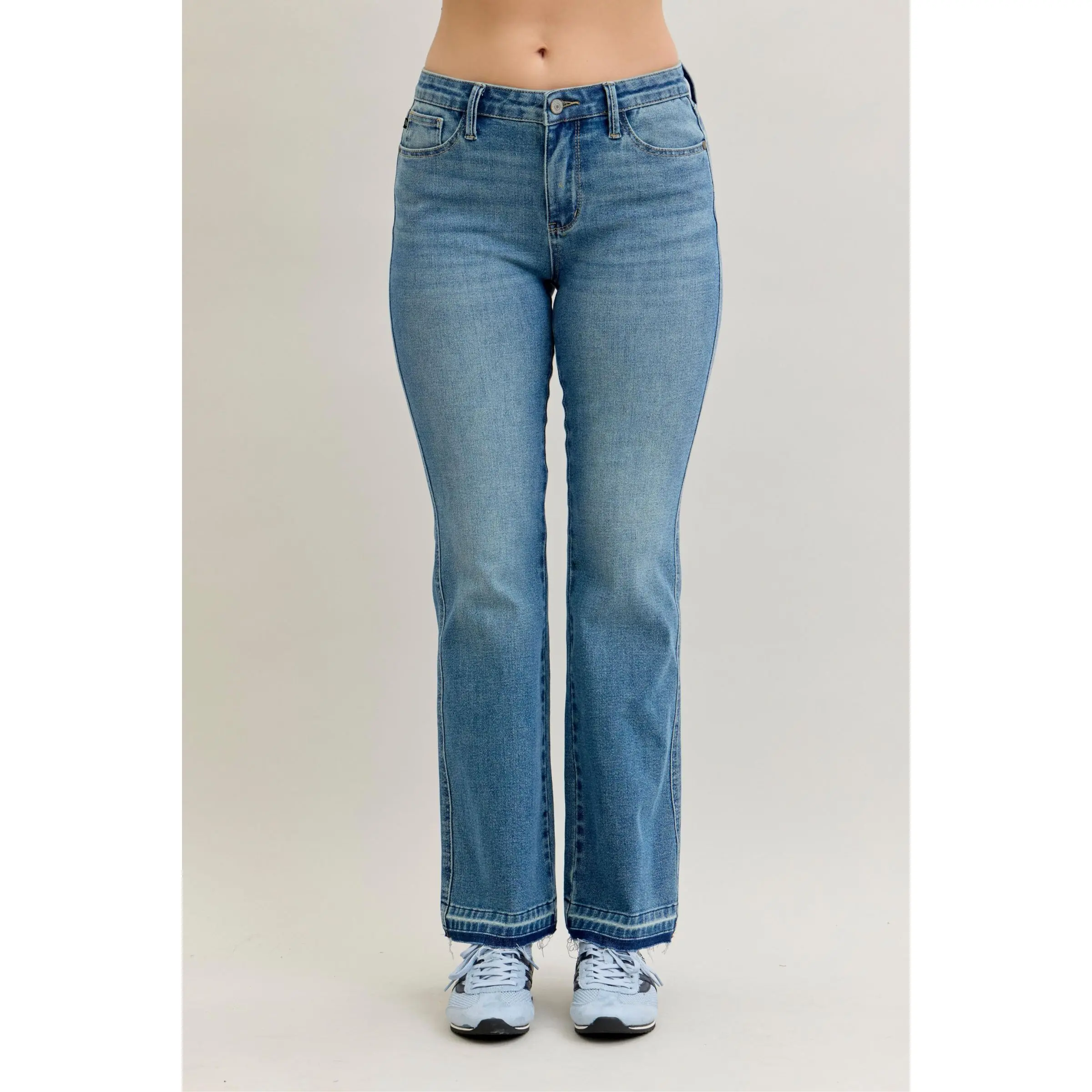 These Judy Blue Pull Me Closer jeans give you a flattering mid-rise fit that smooths your tummy with smart control fabric. The slim bootcut silhouette elongates your legs while the subtle release hem adds a relaxed, easy vibe. Whether regular or plus size, these jeans hug your curves in all the right places with comfort and style to match your playful personality.
