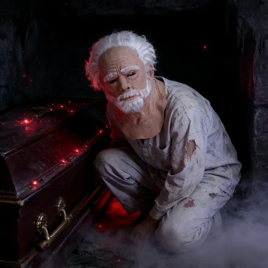 Ultra-realistic elderly features: deep forehead lines, sunken eye sockets, drooping cheeks, and a weather-beaten neck realistically recreate the face of an elderly person, ideal for depicting a terrifying “ghost grandfather” or zombie character.