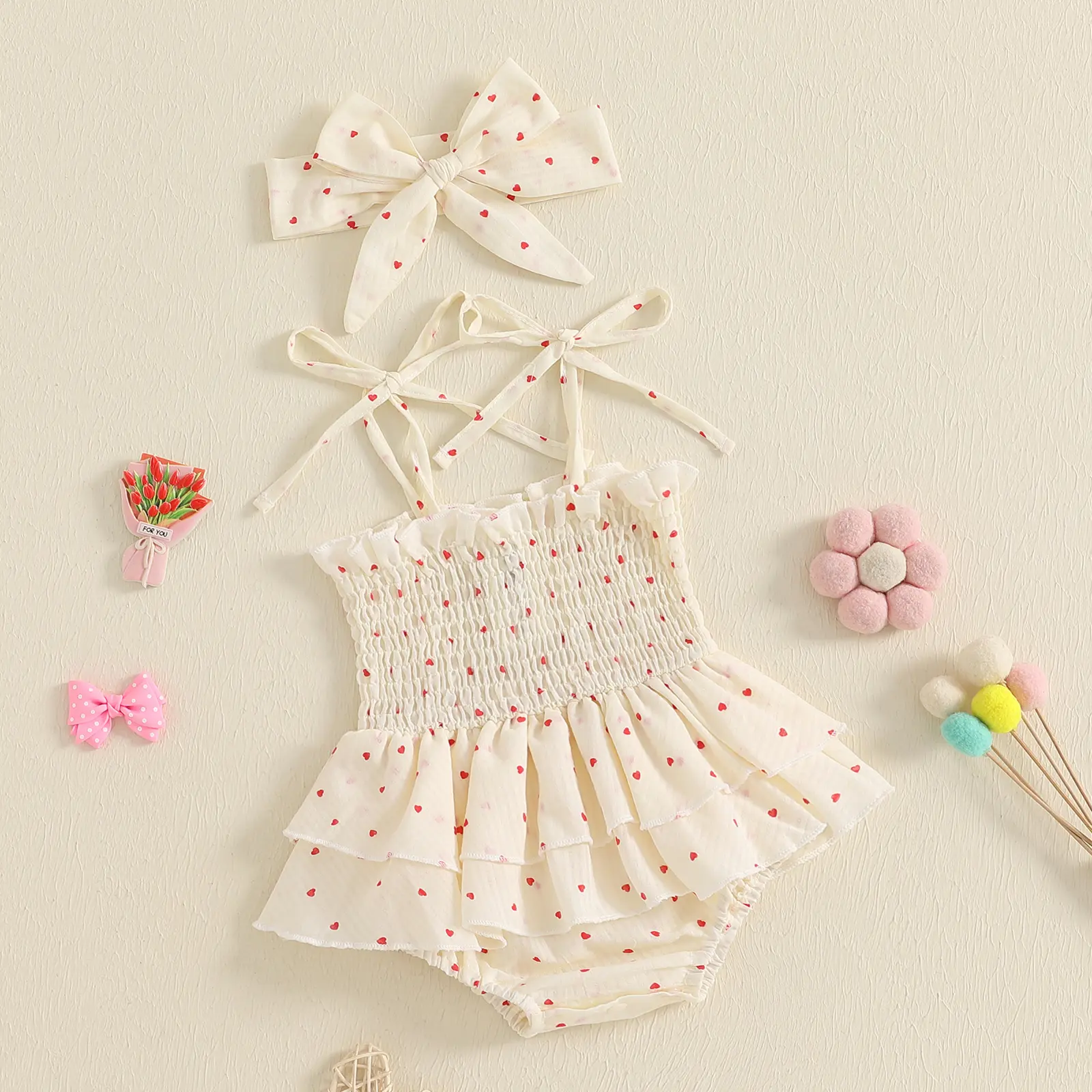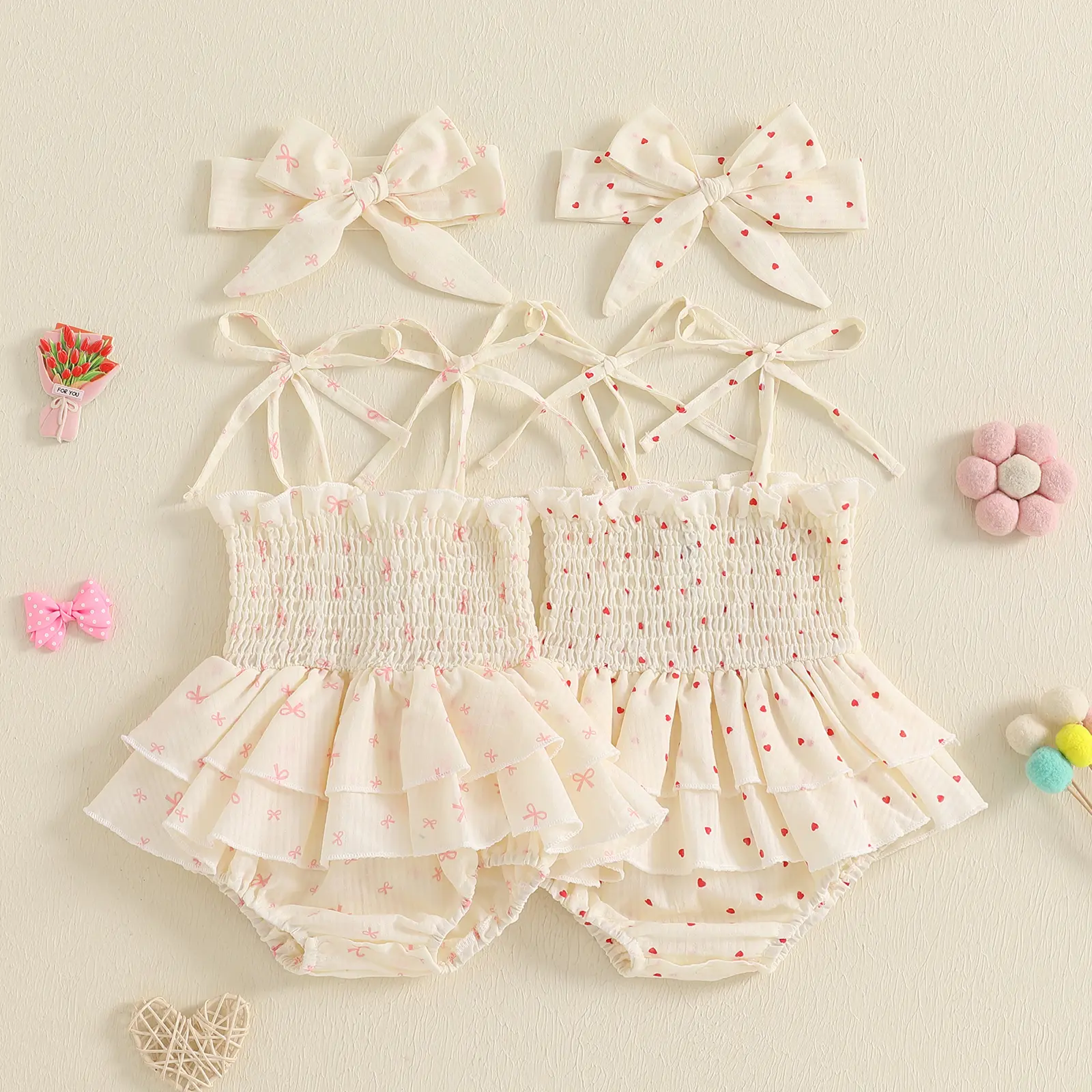 Newborn Girl Outfit, Heart Print Sleeveless Romper Dress with Hairband Summer Clothes