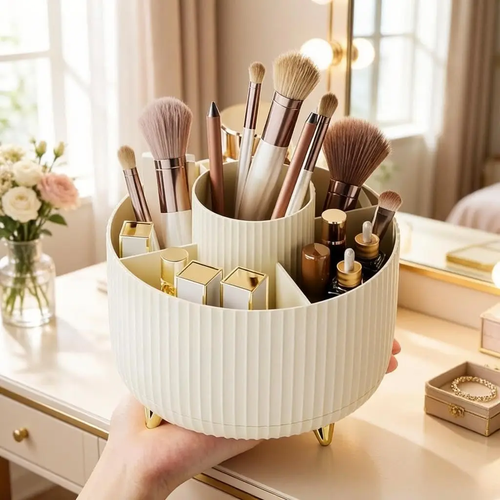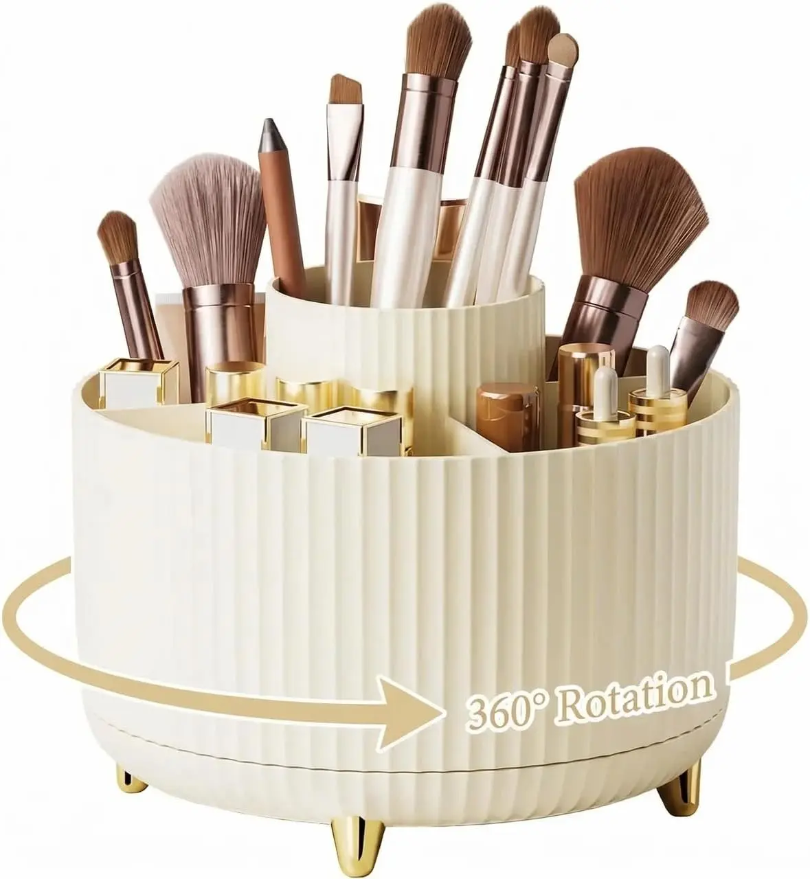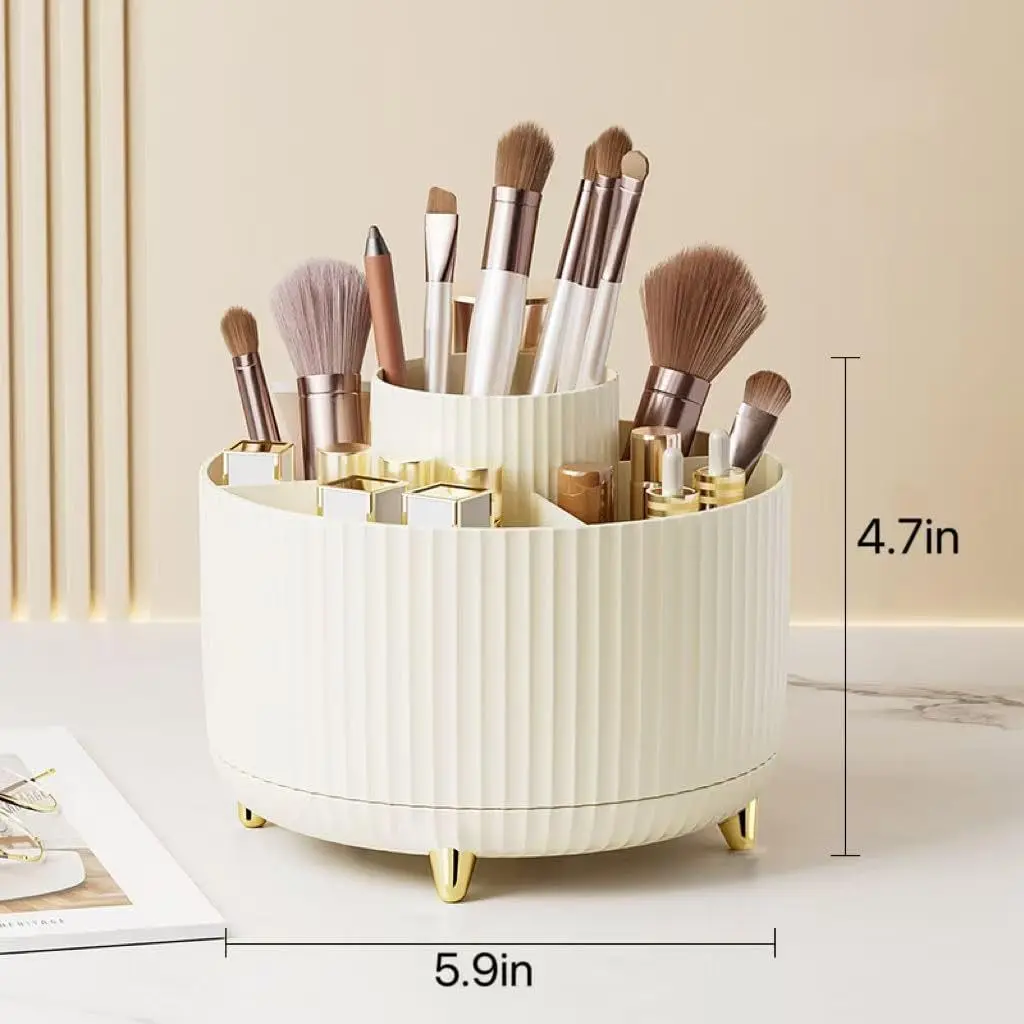 1.360 DEGREE ROTATABLE DESIGN: Makeup organizer cup can be turned up to 360-degree rotation. Smooth rotation without lag,Easier to pick up,Meet your daily needs, Make storage organized and at arm's reach.
