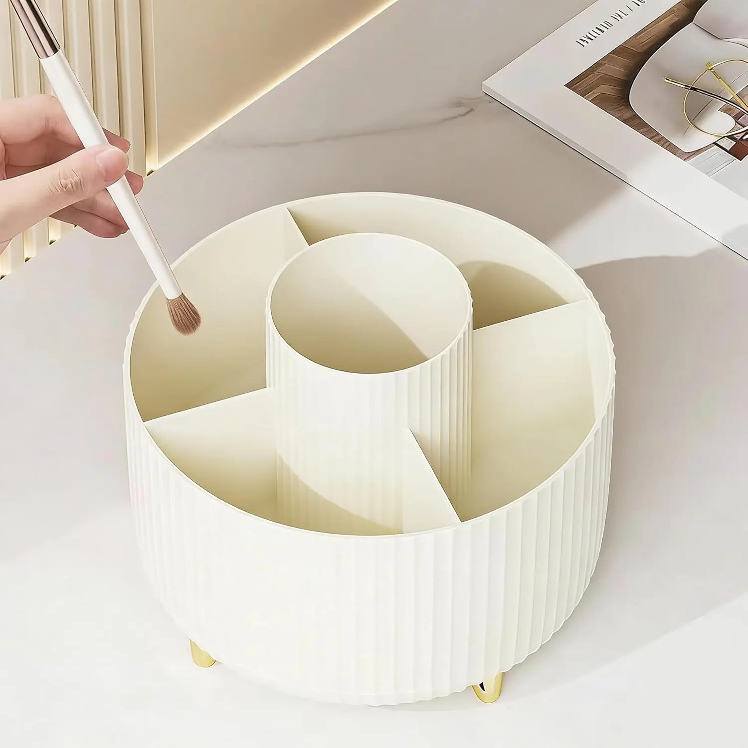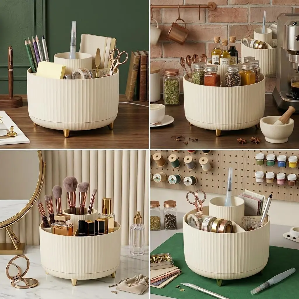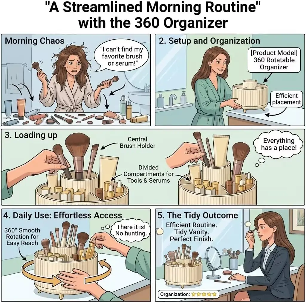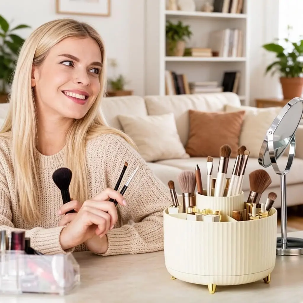 1.360 DEGREE ROTATABLE DESIGN: Makeup organizer cup can be turned up to 360-degree rotation. Smooth rotation without lag,Easier to pick up,Meet your daily needs, Make storage organized and at arm's reach.