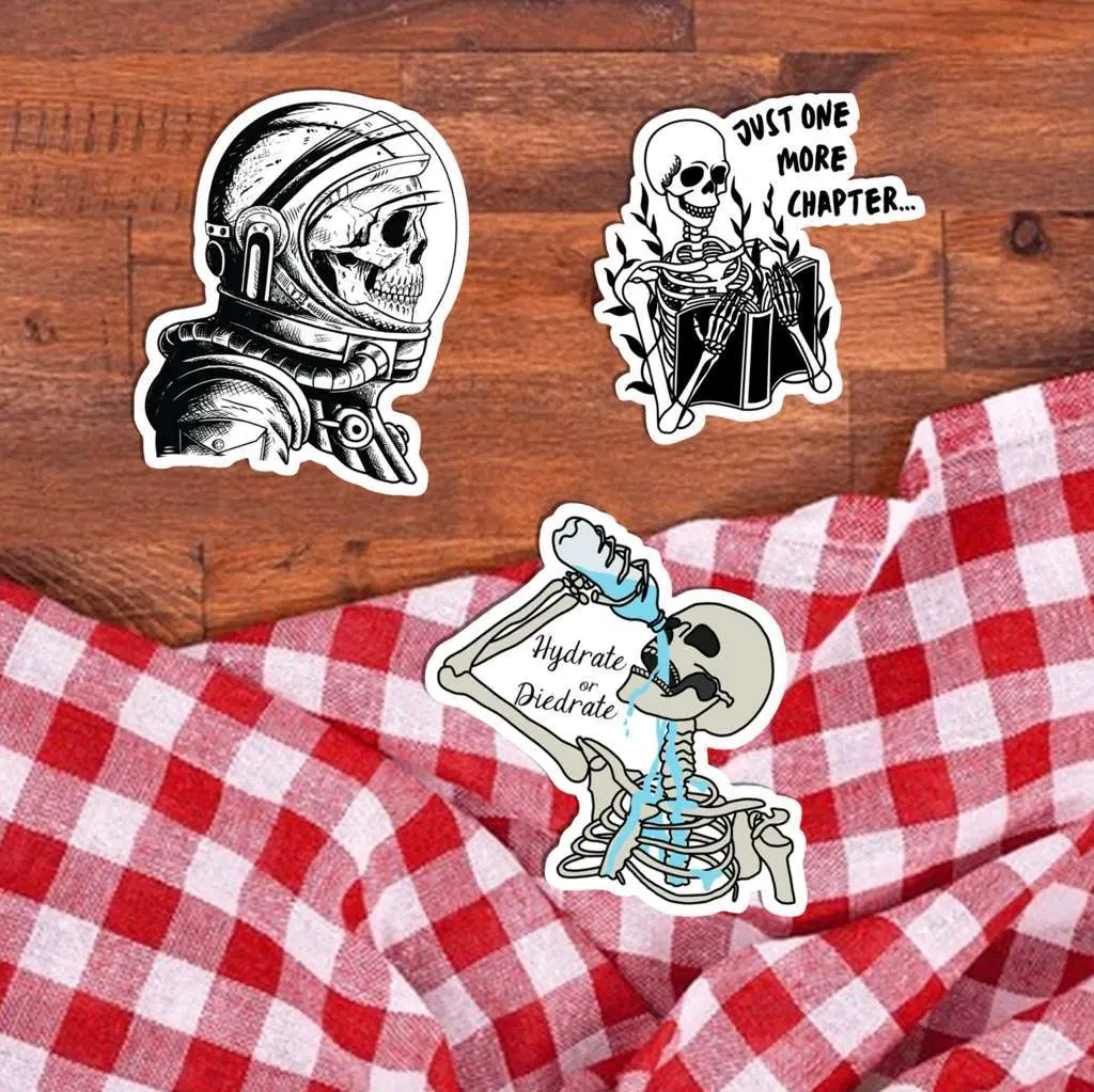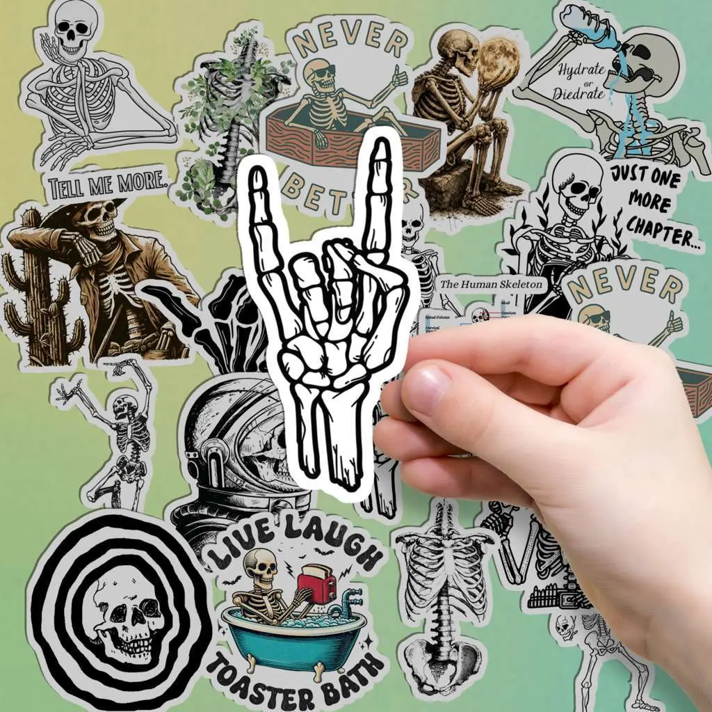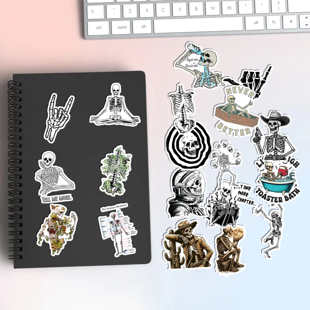 Get spooky and cool with our 18 Pcs Skeleton Stickers! These funny aesthetic gothic skull decals feature unique skeleton designs for laptops and water bottles. Made of waterproof vinyl stickers for Kindles, they offer a durable finish. Perfect goth gifts for teens. Enhance your dark grunge stationery today. 👉 Click Add to Cart to bring some bone-afide style to your gear!