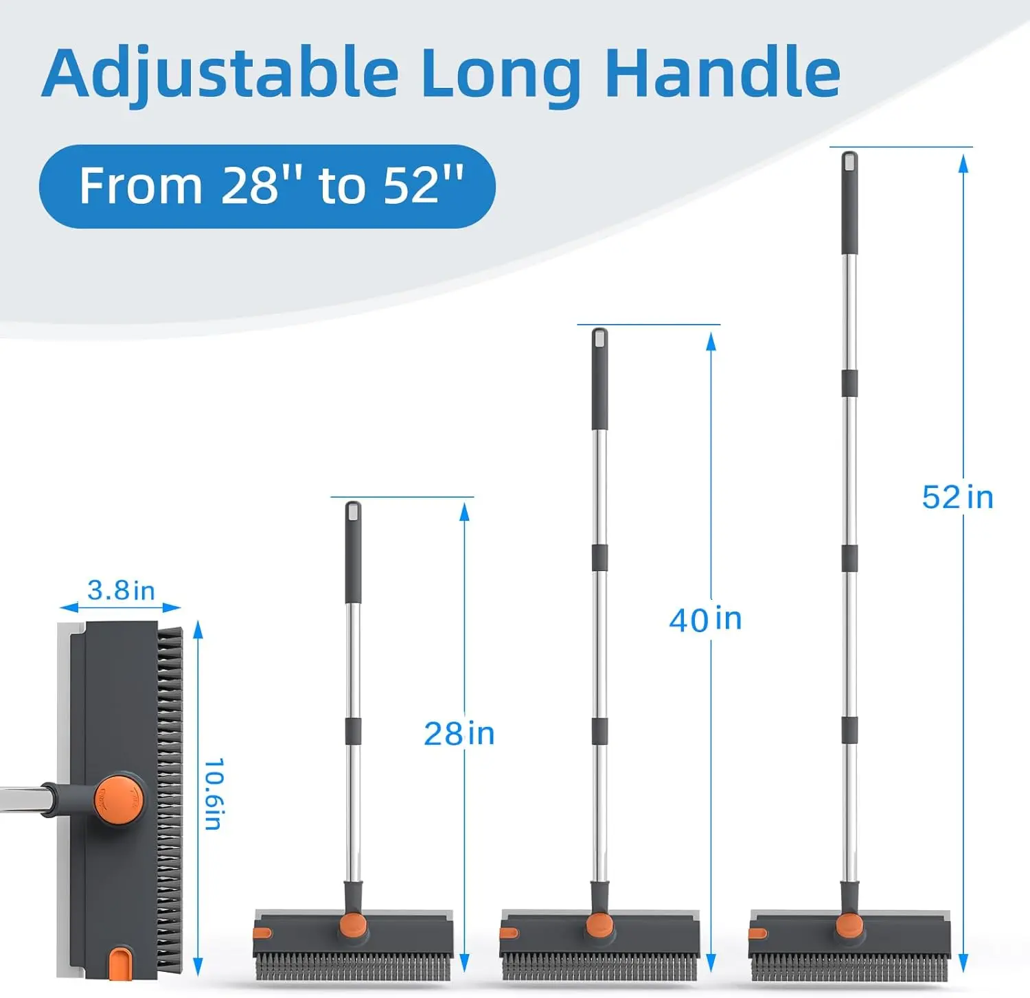 ·Adjustable Extended Handle: Customize your reach! The sturdy stainless-steel handle extends from 16" to 52", so you can clean floors, windows, and showers standing up—no bending or back pain. addition, the handle top has hole for hung in any location
