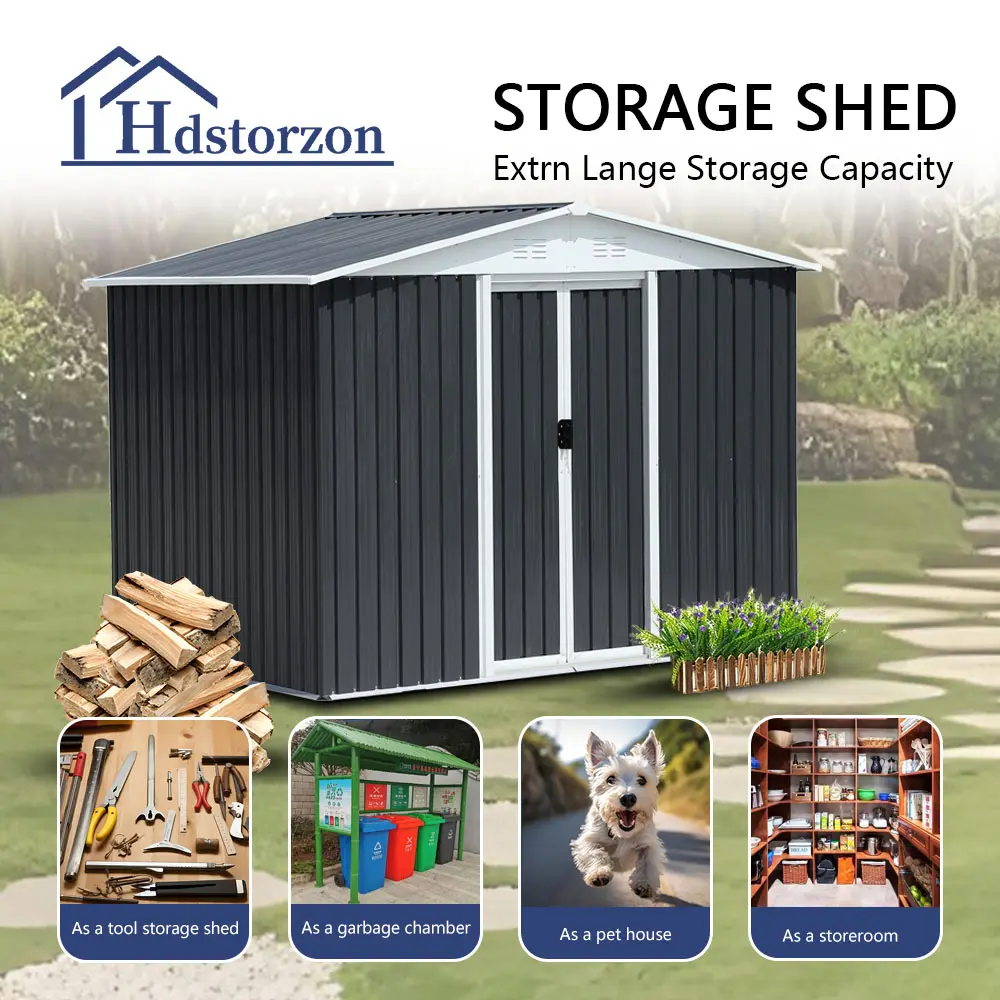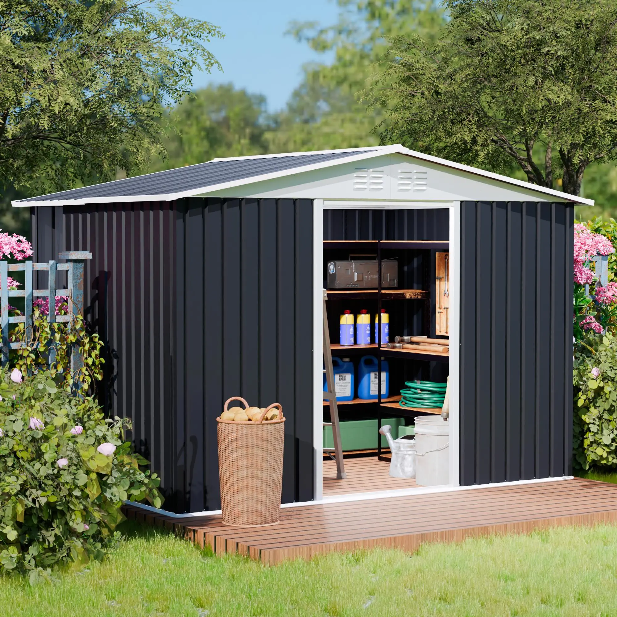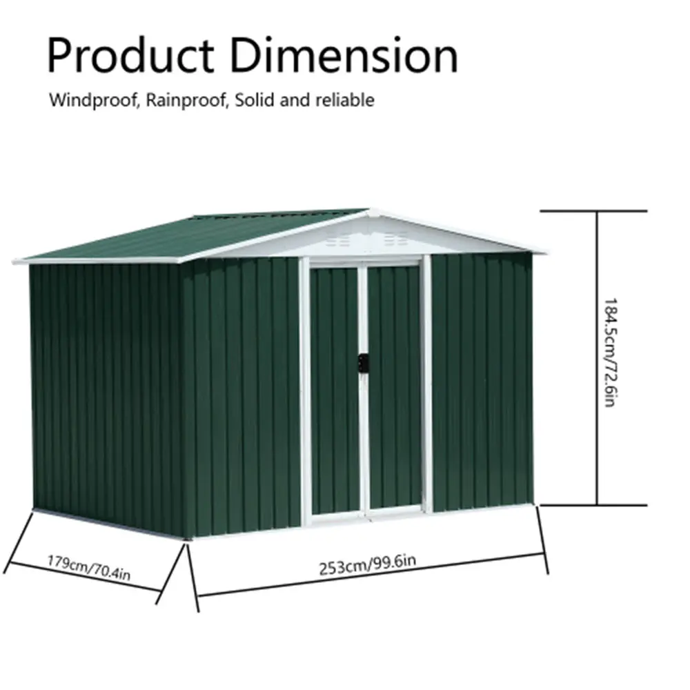 Transform your backyard with this 8x6FT Metal Storage Shed. Perfect for garden tools and outdoor storage, it features a lockable double door for security. The sloping roof design ensures efficient water drainage. Ideal for maintaining an organized outdoor space.