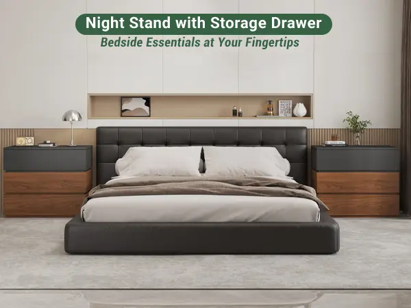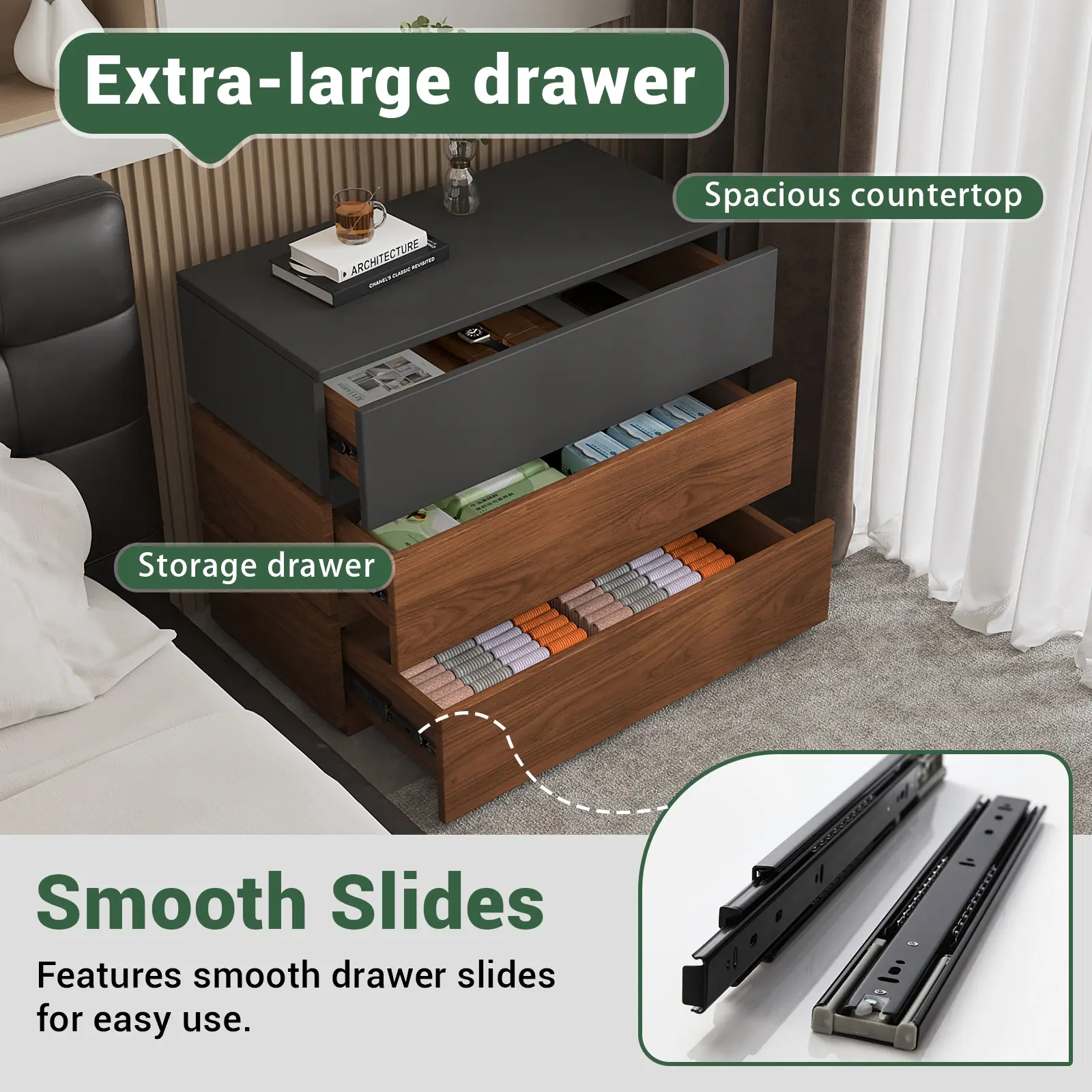 ·SPACIOUS STORAGE WITH 3 SMOOTH-GLIDE DRAWERS — Premium Nightstand Features Three full-Sized Drawers Designed to Keep Your Bedside Essentials Within Easy Reach. Each Drawer is Equipped with Smooth Metal Glides for Effortless Open-and-close Operation, Reducing Noise and Maximizing Durability. Luxury Nightstand with Drawers Perfect for Storing Books, Remotes, Chargers, Glasses, and Nightly Essentials — Everything Organized, Nothing Cluttered.