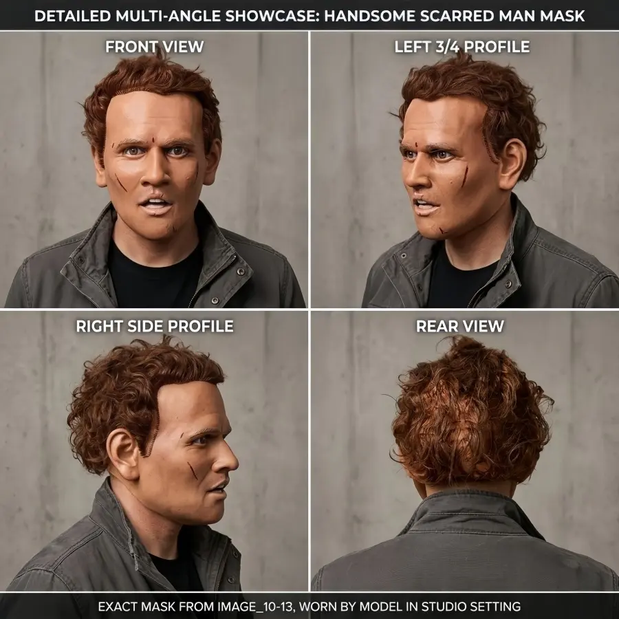 This ultra-realistic handsome young man latex mask will add even more charm to your costume! This premium limited-edition prop is designed for carnivals, cosplay, Halloween, and themed parties. Its highly detailed features provide an immersive role-playing experience, allowing you to transform into a striking “wounded hero” and draw attention on any occasion. This mask seamlessly combines rugged charm, cinematic realism, and exquisite craftsmanship, making it ideal for adult cosplay enthusiasts to create a striking look.