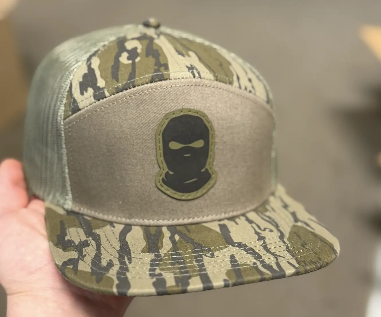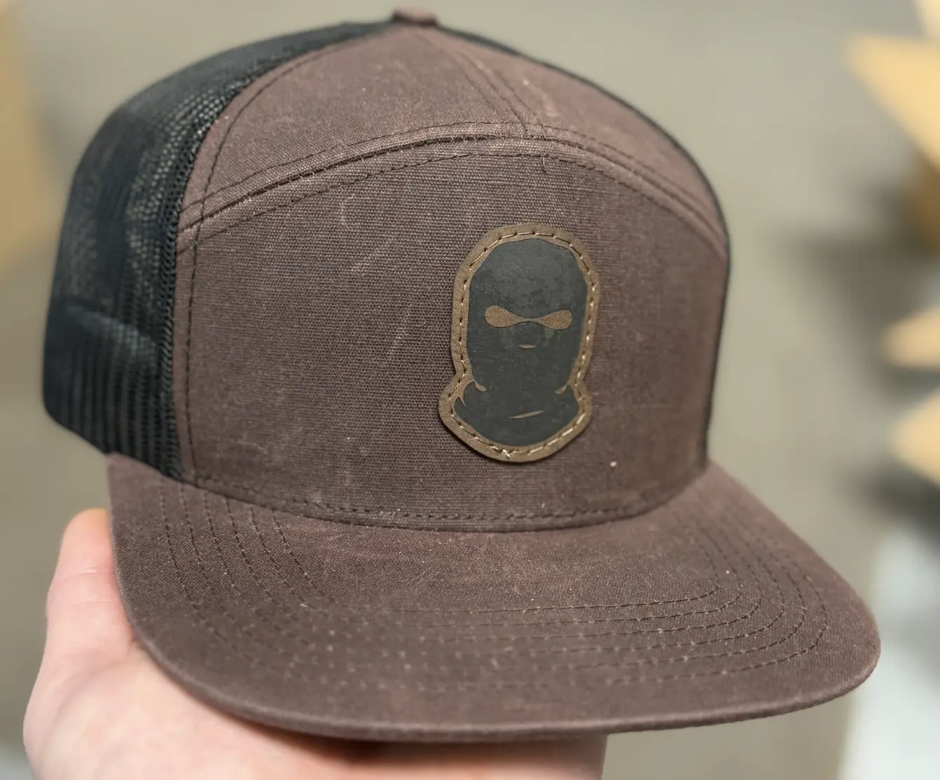 Lost Panel Hat with leather mask patch. Snap Back hat with mesh back. Leather patch is engraved with Cartel Custom Calls Logo.OSFM