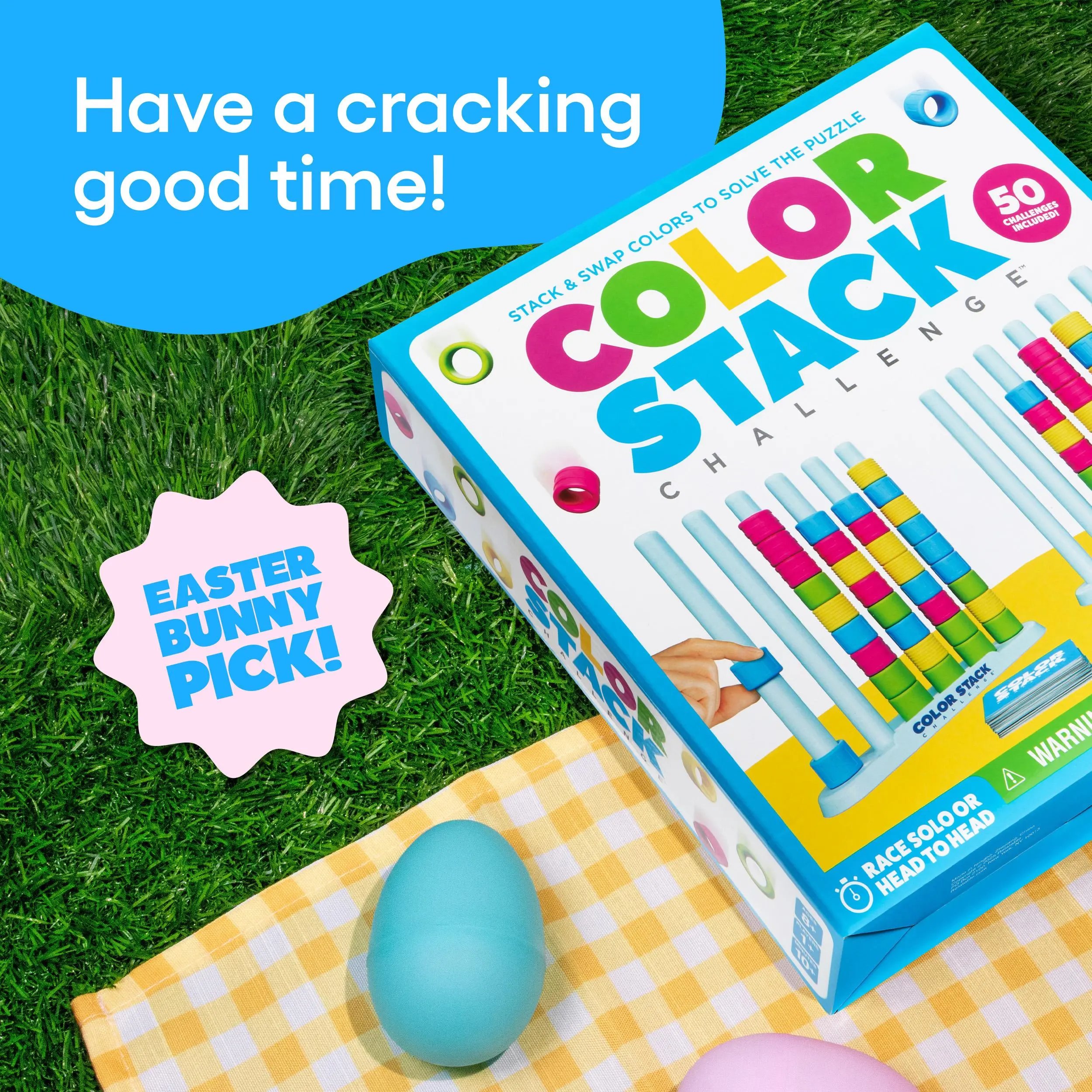 Stack, Swap, and Solve: Players pick between Easy or Hard mode, then race to organize the colored rings on their rack first.It's brain games, puzzle games and easter family games all in one compact box.A fun easter gift and non candy easter basket stuffer.