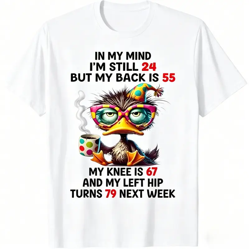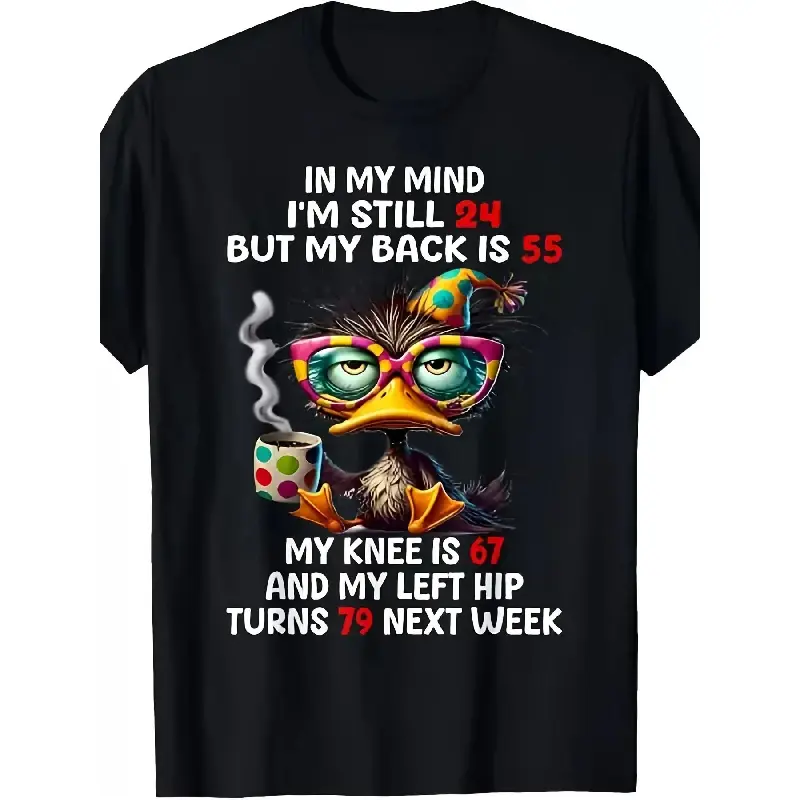 Upgrade your wardrobe with this hilarious men's graphic t-shirt!It features a grumpy coffee-loving duck and the iconic aging joke: "In My Mind I'm Still 24, But My Back Is 55, My Knee Is 67, And My Left Hip Turns 79 Next Week."Perfect for anyone with a sense of humor about aging.