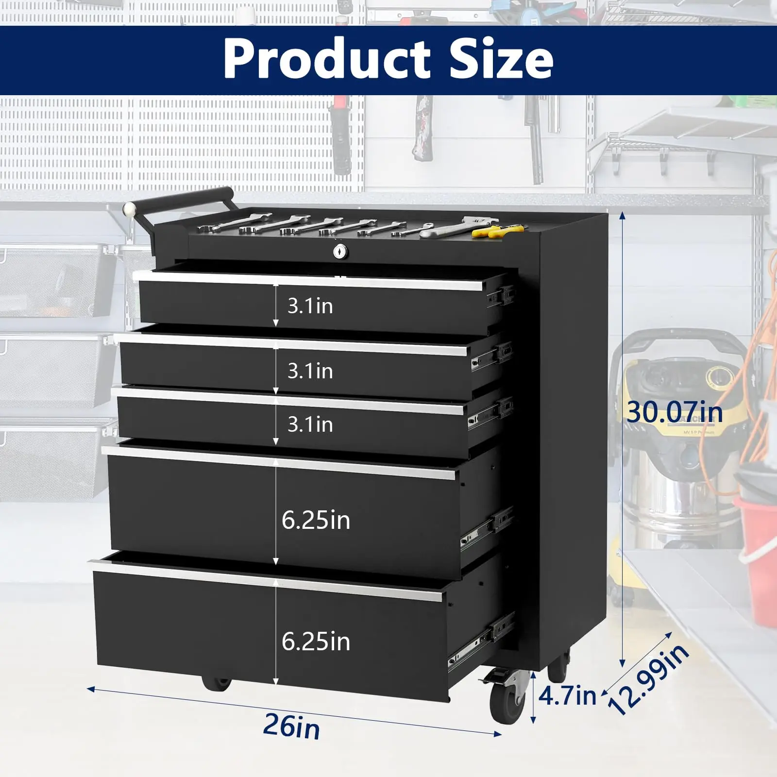 ·【Versatile Drawer Layout】 The 5-drawer rolling tool chest features both deep and shallow compartments to store hand tools, sockets, and power equipment. The roomy top compartment offers fast access to frequently-used items, while full-extension, ball-bearing slides deliver smooth drawer operation and easy organization.