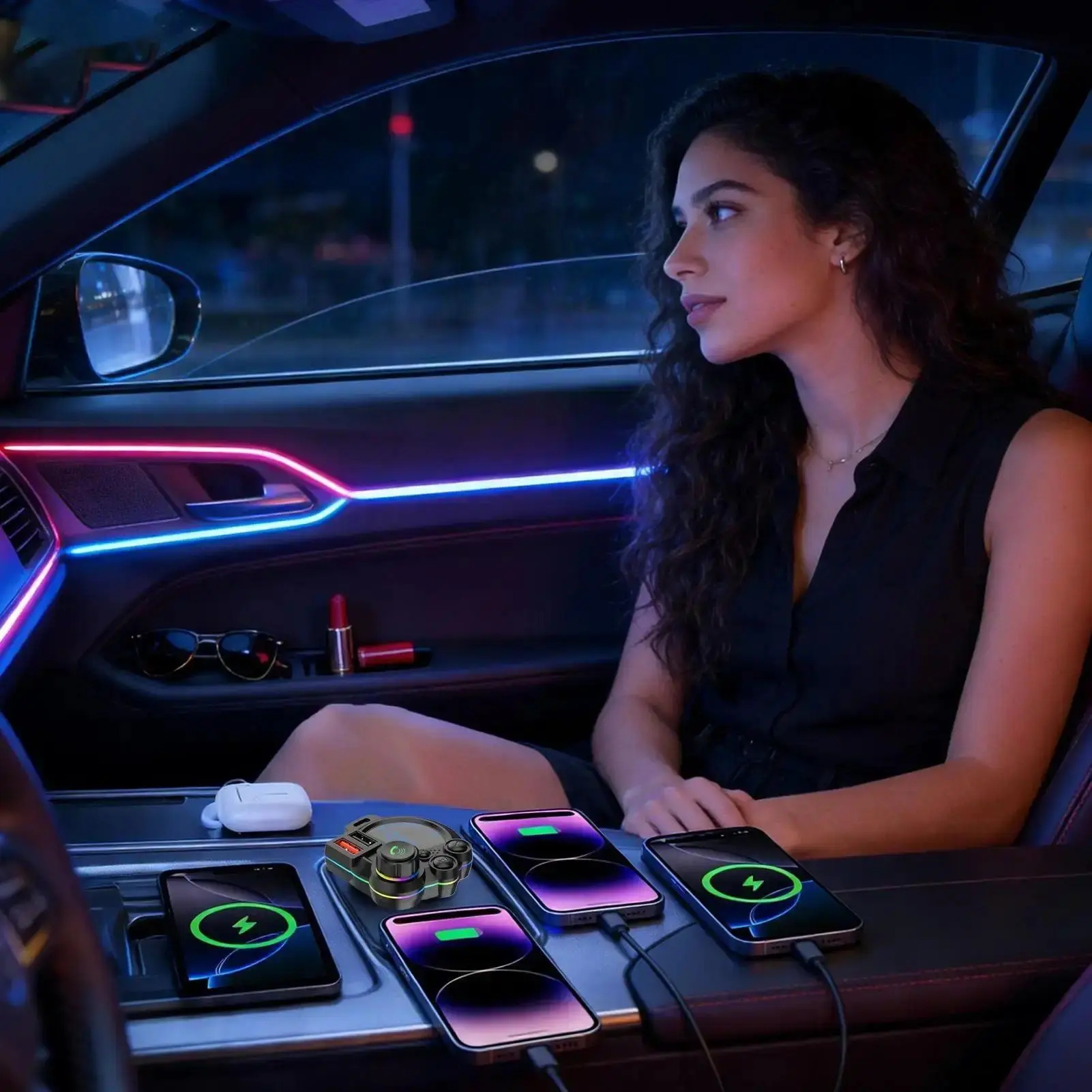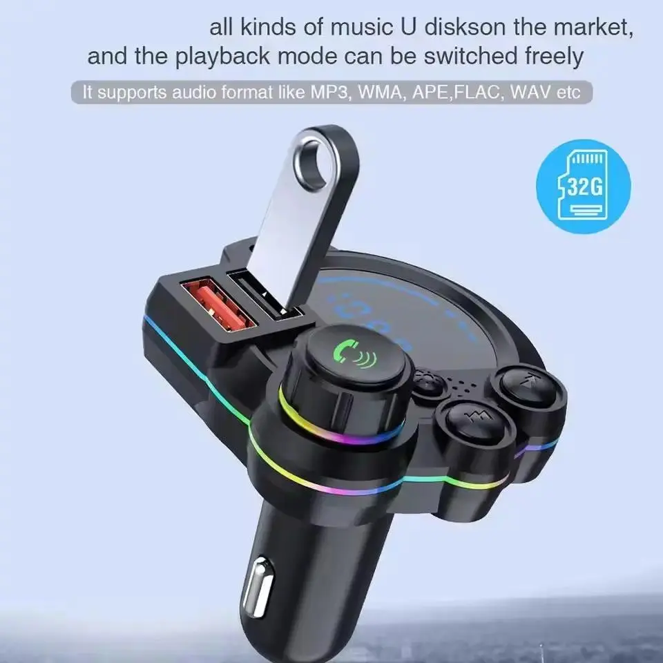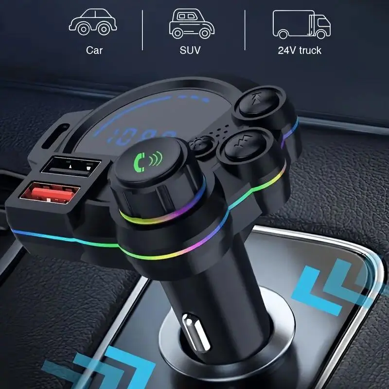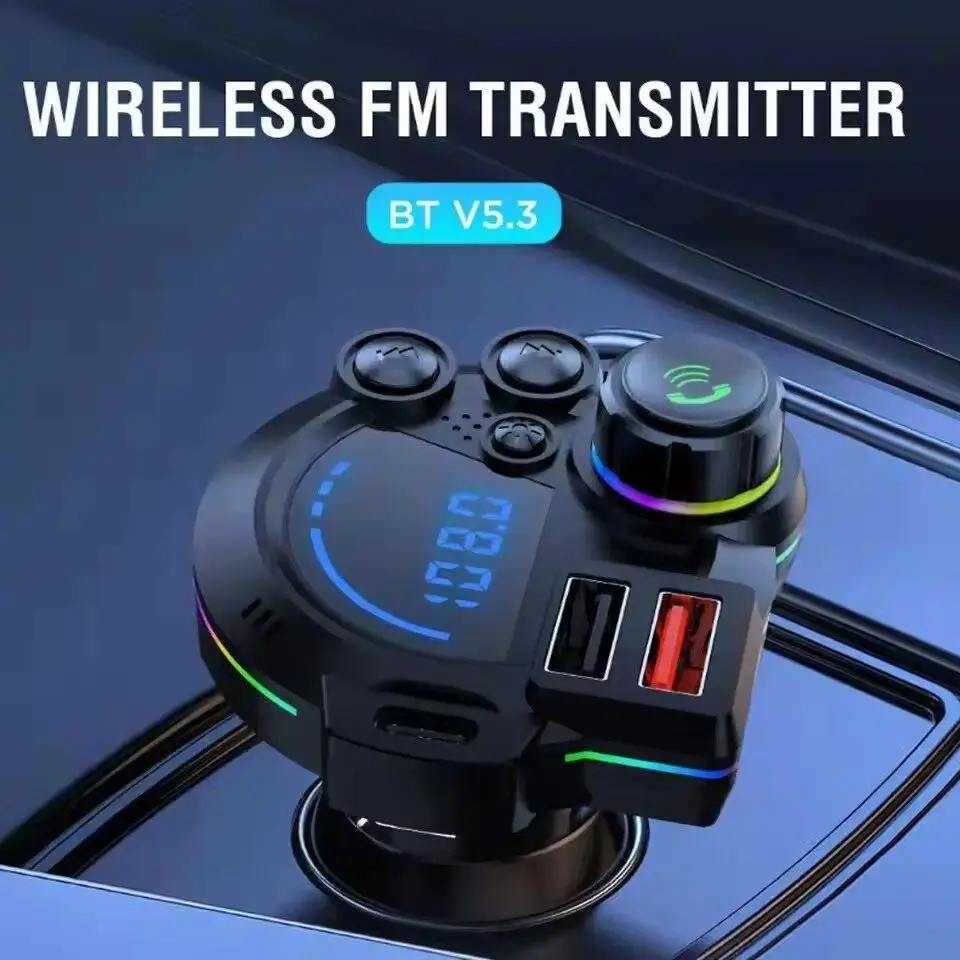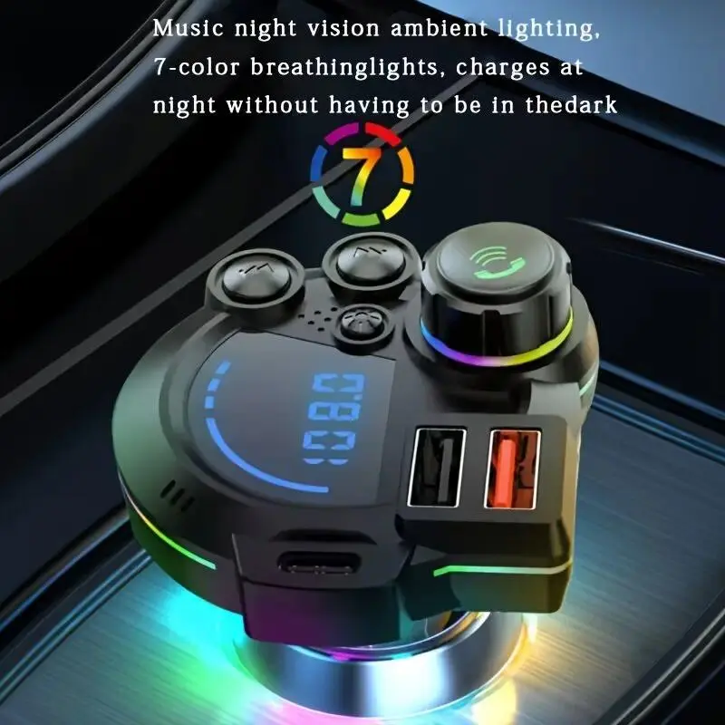 Bluetooth 5.3 Car FM Transmitter Fast Charging: Supports PD 20W + QC 3.0, ensuring your devices charge quickly and efficiently. HD Bluetooth Audio Enjoy clear and immersive audio: With HD Bluetooth technology, you get a superior listening experience. LED Display Easy monitoring: The LED display shows the charging status for convenience. Colorful Ambient Lighting Enhance your environment: Colorful ambient lighting adds a vibrant touch to your car. Comprehensive Experience This product combines fast charging, HD audio, an LED display, and ambient lighting for a comprehensive charging and audio experience. Perfect for charging multiple devices simultaneously.