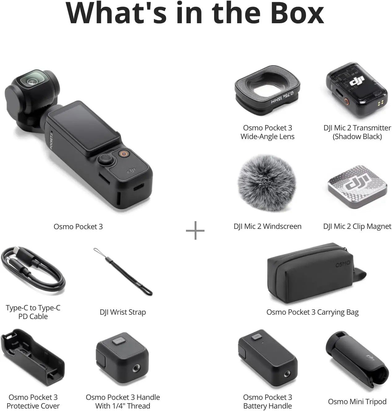 ·In the box: Osmo Pocket 3 × 1, Type-C to Type-C PD Cable × 1, Osmo Pocket 3 Protective Cover × 1, DJI Wrist Strap × 1, Osmo Pocket 3 Handle With 1/4″ Thread × 1, Osmo Pocket 3 Wide-Angle Lens × 1, DJI Mic 2 Transmitter (Shadow Black) × 1, DJI Mic 2 Windscreen × 1, DJI Mic 2 Clip Magnet × 1, Osmo Pocket 3 Battery Handle × 1, Osmo Mini Tripod × 1, Osmo Pocket 3 Carrying Bag × 1