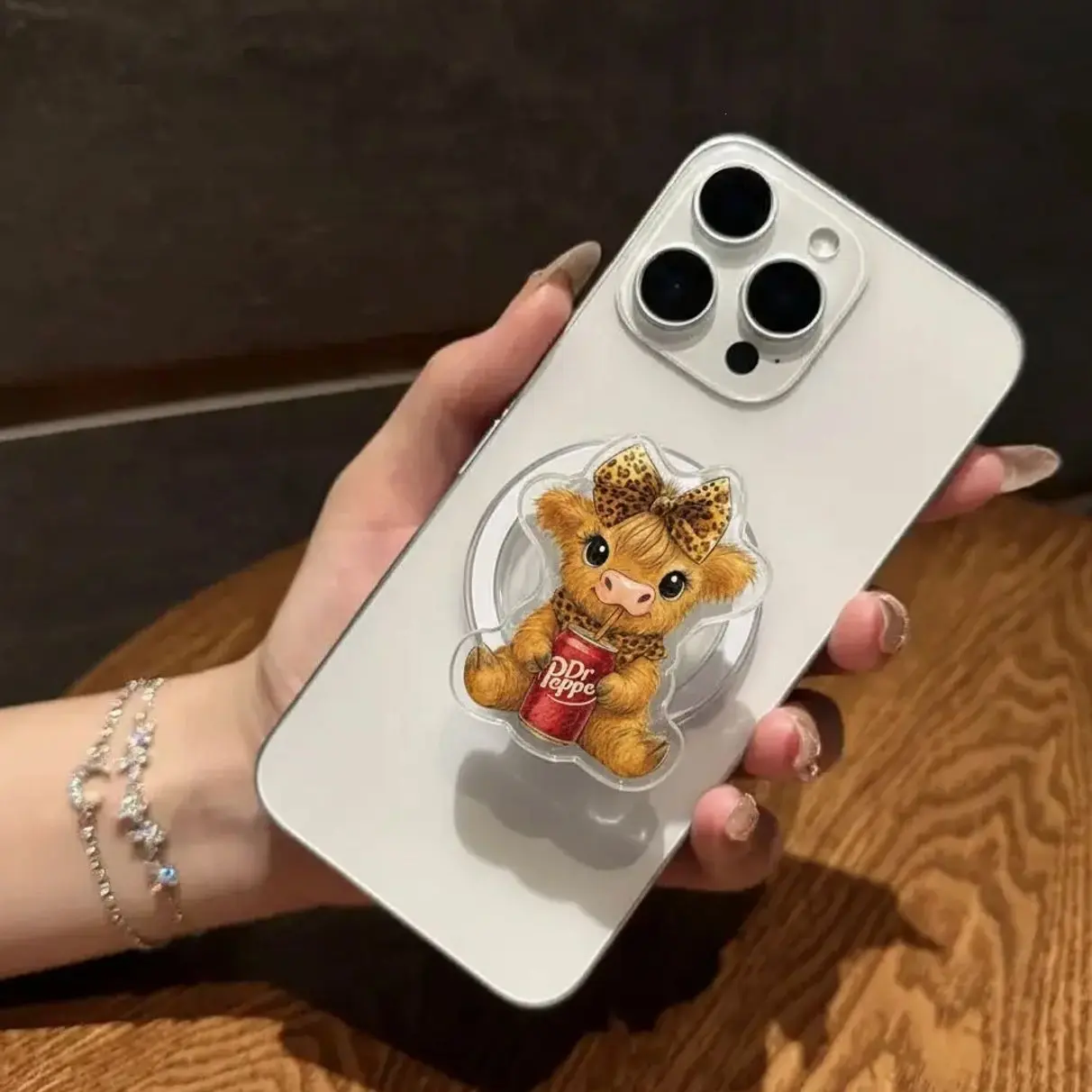 Cute Highland Cow Soda Lover Magsafe Phone Grip Detachable Magnetic Kickstand, Funny Farm Aesthetic Gift For Drink Fans