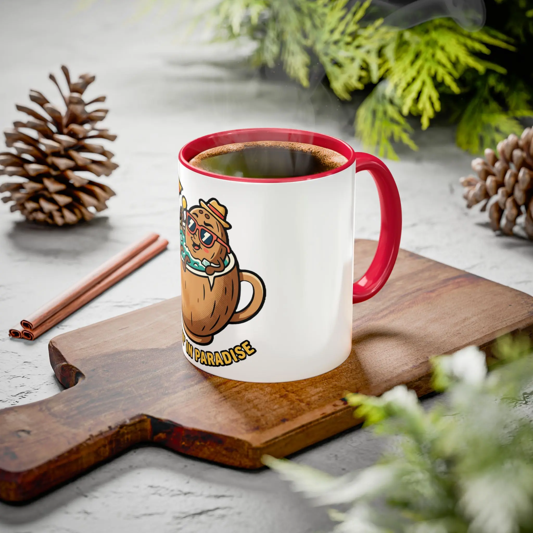 Bright, cheerful, and full of vacation vibes — this ceramic mug brings a little tropical escape to your everyday routine. A playful coconut-cup character lounges in cool shades, umbrella and pineapple in tow, while the glossy ORCA finish makes every color pop. Choose your favorite accent color and size to match your morning mood, and let this mug turn ordinary sips into a small celebration of sun, sand, and slow moments.