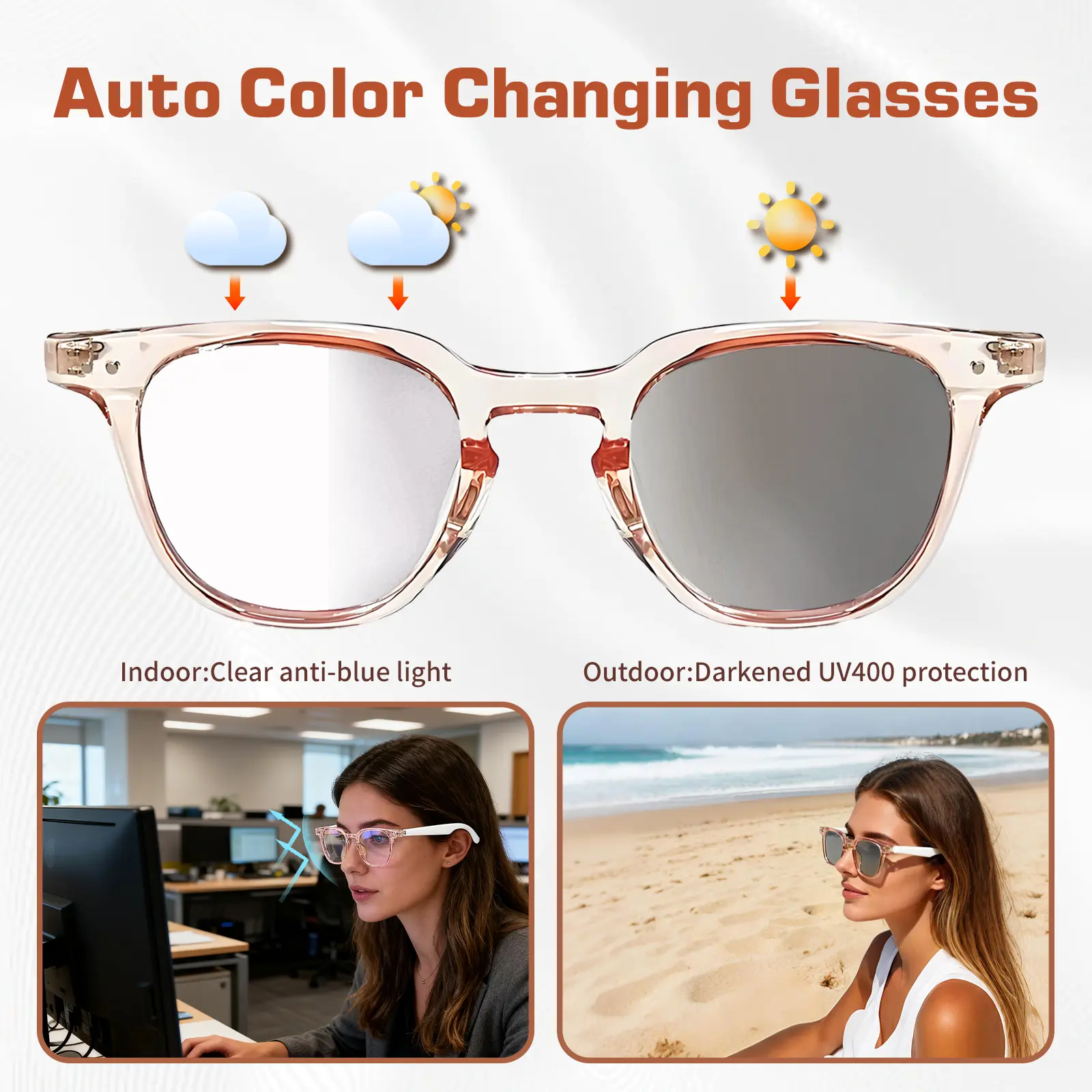 ·Photochromic Blue Light Filtering Lens: These polarized sunglasses feature photochromic lenses that automatically adjust their tint based on light, darkening outdoors under sunlight and returning to clear indoors. The lenses of the smart glasses also help block blue light from screens. Whether you're driving in bright sunlight, walking outdoors, or working in the office, the blue sunglasses provide comfortable vision throughout the day.
