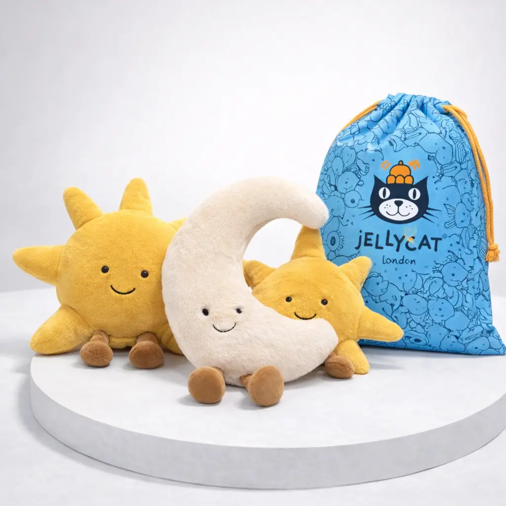 Bring a soft and cheerful touch to any space with this adorable Jellycat Amuseables Sun and Moon Plush Set. Featuring a sweet smiling moon and two happy sunshine plush toys, this charming celestial bundle is perfect for kids, nursery decor, plush collectors, and anyone who loves cute and comforting gifts. Made with super soft plush fabric and lovely embroidered details, this set is ideal for cuddling, shelf styling, bedtime comfort, baby shower gifts, birthdays, or adding a cozy aesthetic to any room. A cute Jellycat gift bag is included, making it even more special for gifting.
